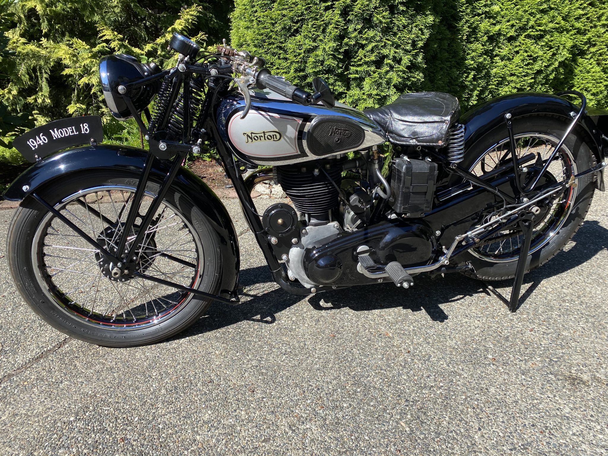 Wire wheels were laced with stainless steel spokes under current ownership, while the rims were rechromed and finished with black and red center stripes. 1946 was the final model year for mechanical girder forks, while the rear end is rigid. Braking is from drums at both ends.