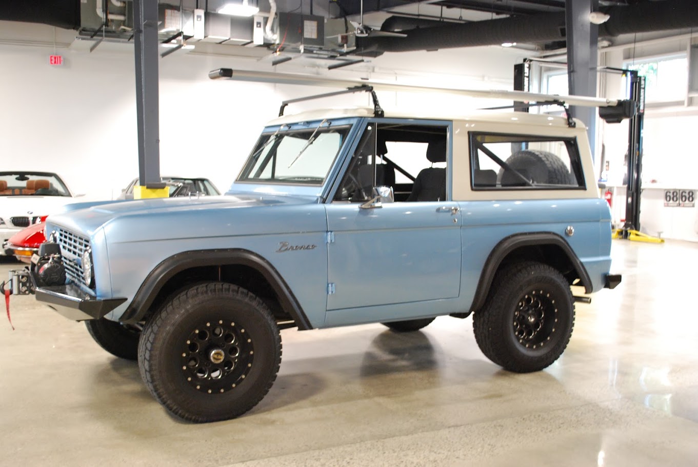 Black flares cover the wheel arches, the rears of which have been modified to clear 32″ Wild Country tires on Fuel wheels. A matching spare is mounted out back. The truck has been fitted with power-assisted steering and four-wheel disc brakes.