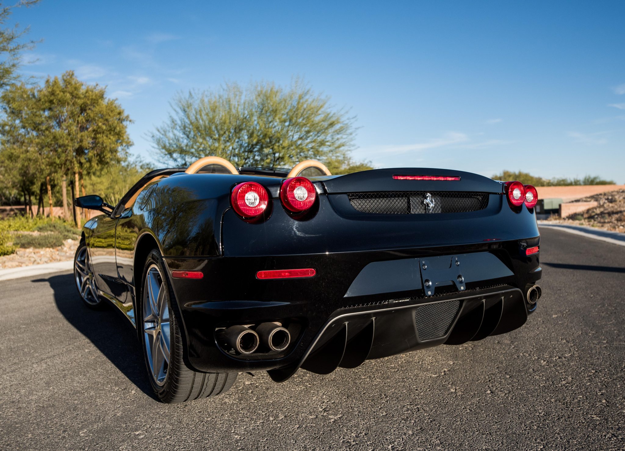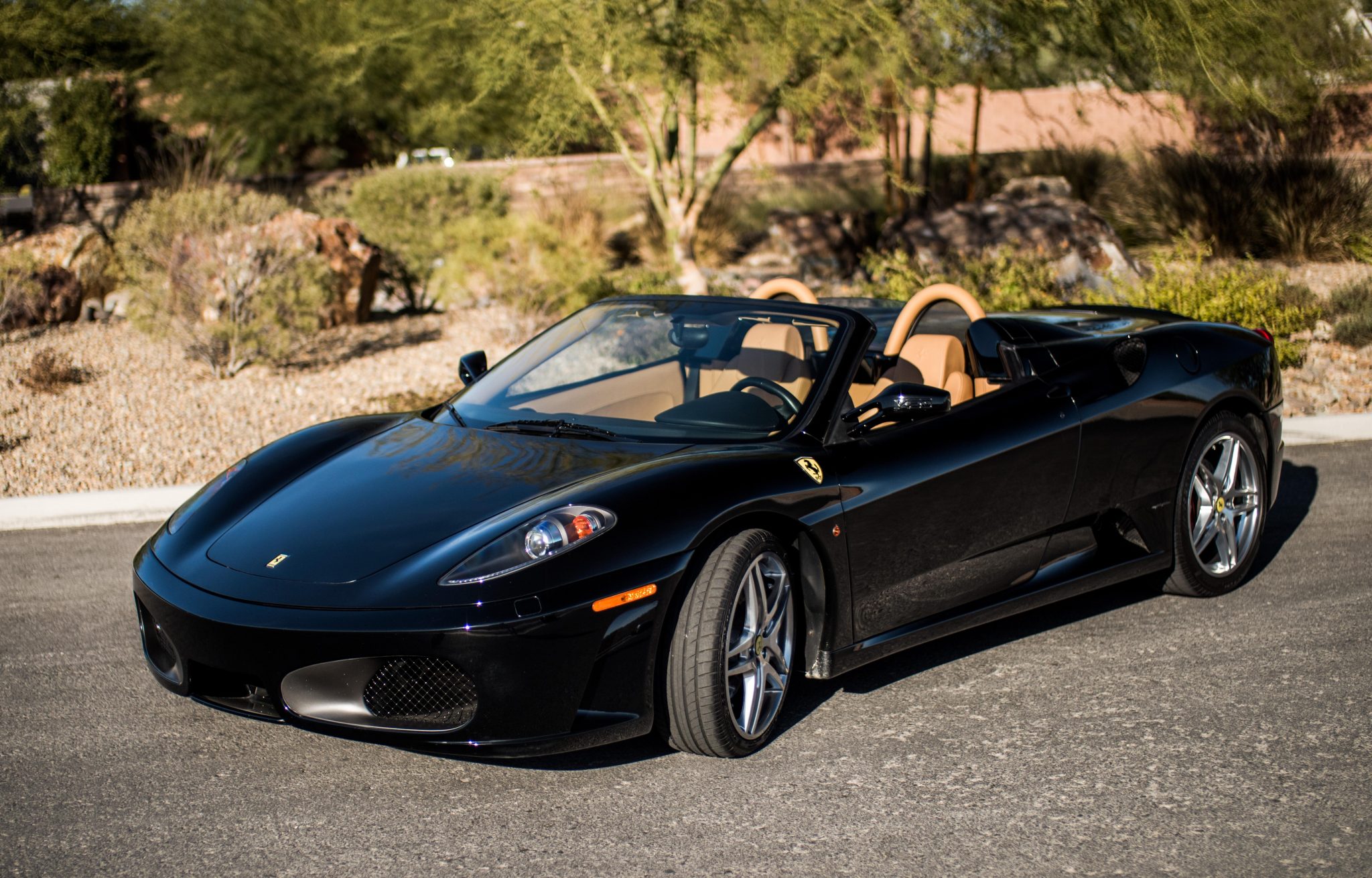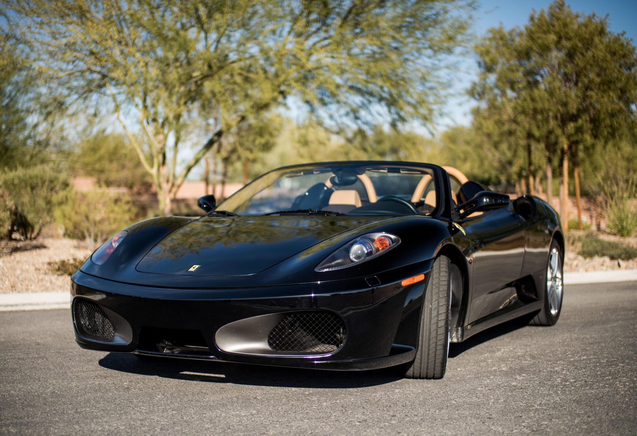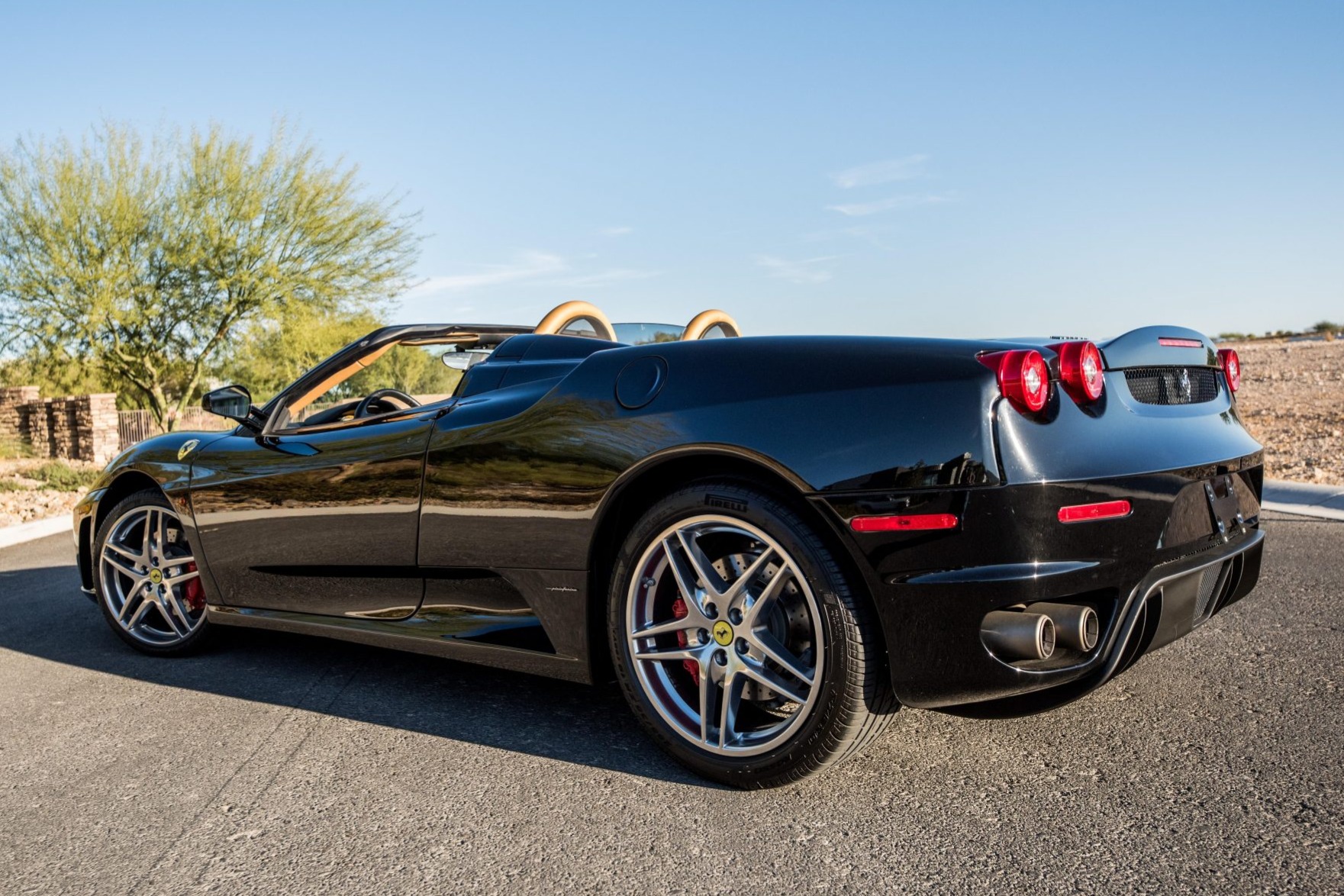 Polished 19” split-spoke wheels feature yellow Prancing Horse center caps and are mounted with Pirelli P Zero tires said to have been recently replaced and measuring 225/35 up front and 285/35 out back. Stopping power is provided by cross-drilled rotors with red Ferrari-branded calipers at all four corners. A brake fluid flush was performed in October 2020 by Italy’s Service, Inc. of Las Vegas, Nevada.