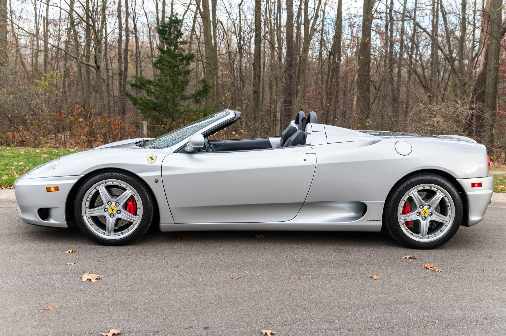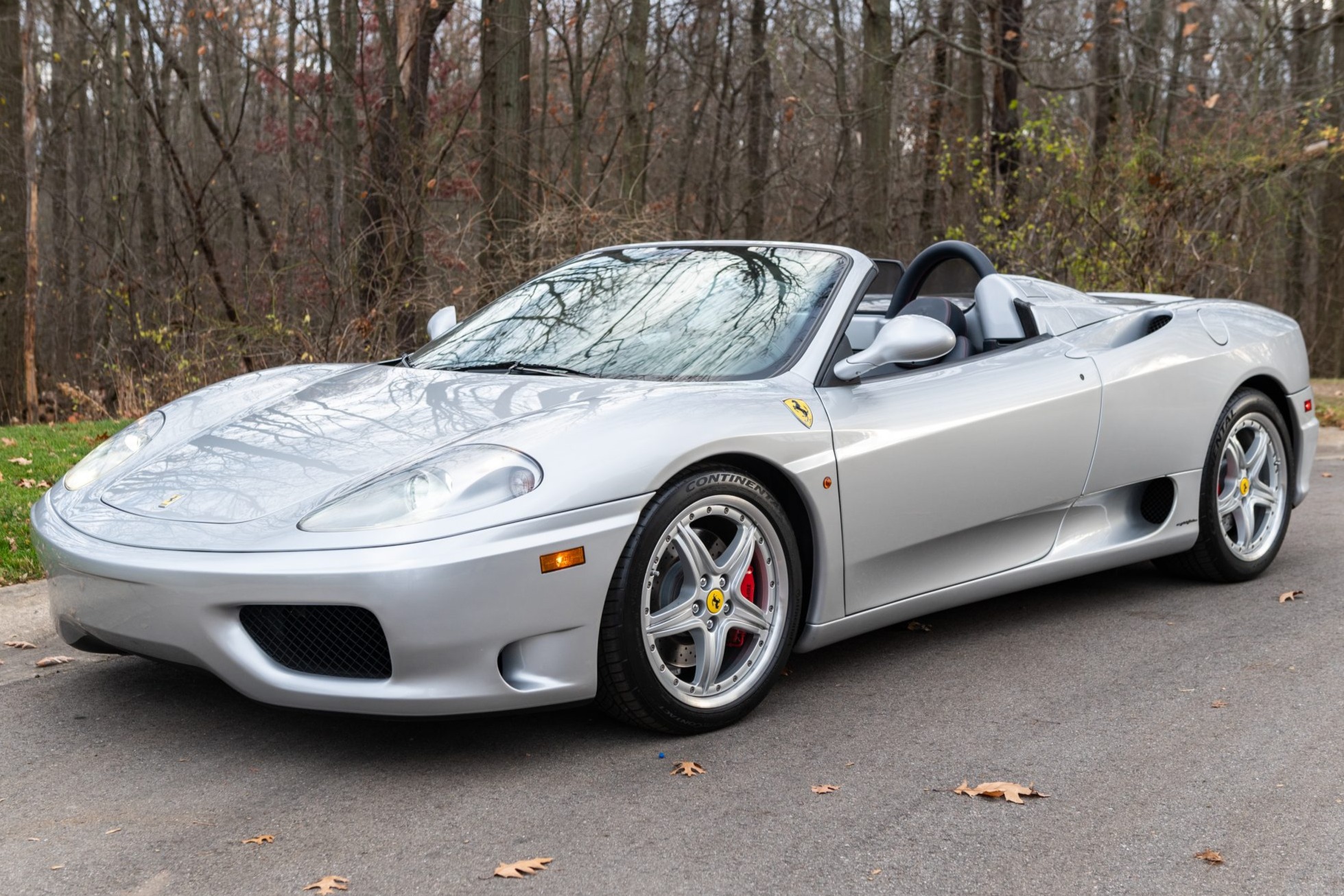 Optional 18″ modular wheels are mounted with Continental ExtremeContact tires. Braking is handled by cross-drilled rotors with red calipers. Originally dark blue, the convertible top was replaced with a black version under previous ownership.