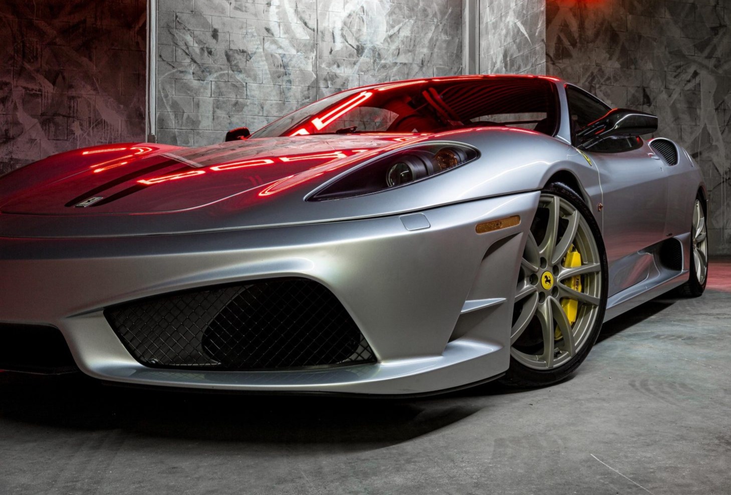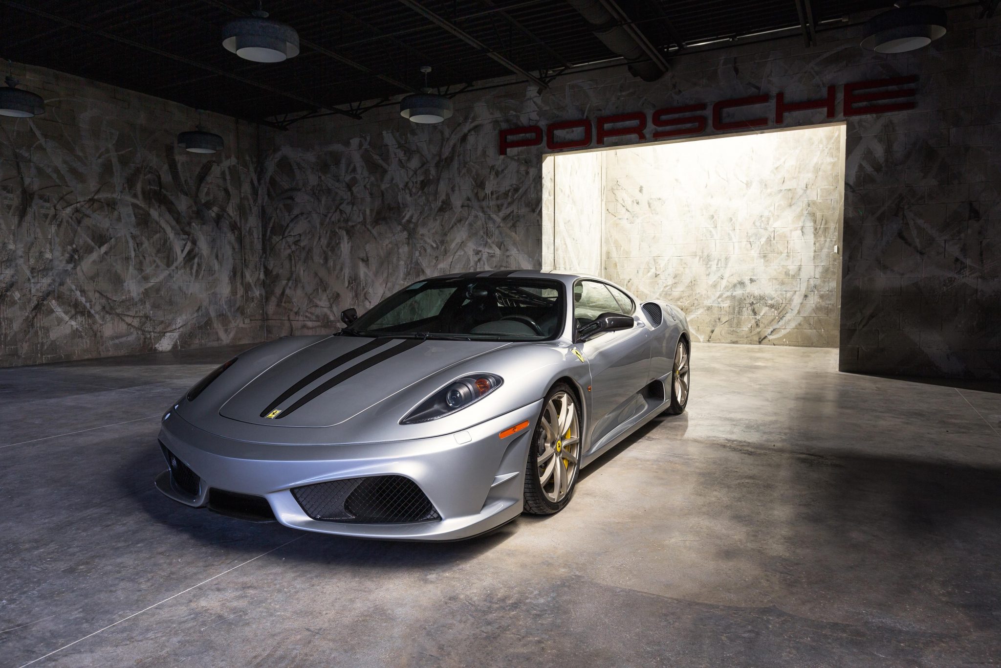 Factory 19” wheels are finished in satin titanium and wrapped in Pirelli P Zero tires showing 2017 date codes. Stopping power is provided by carbon-ceramic discs paired with yellow calipers, and the factory coilover suspension has been adjusted to lower the ride height.