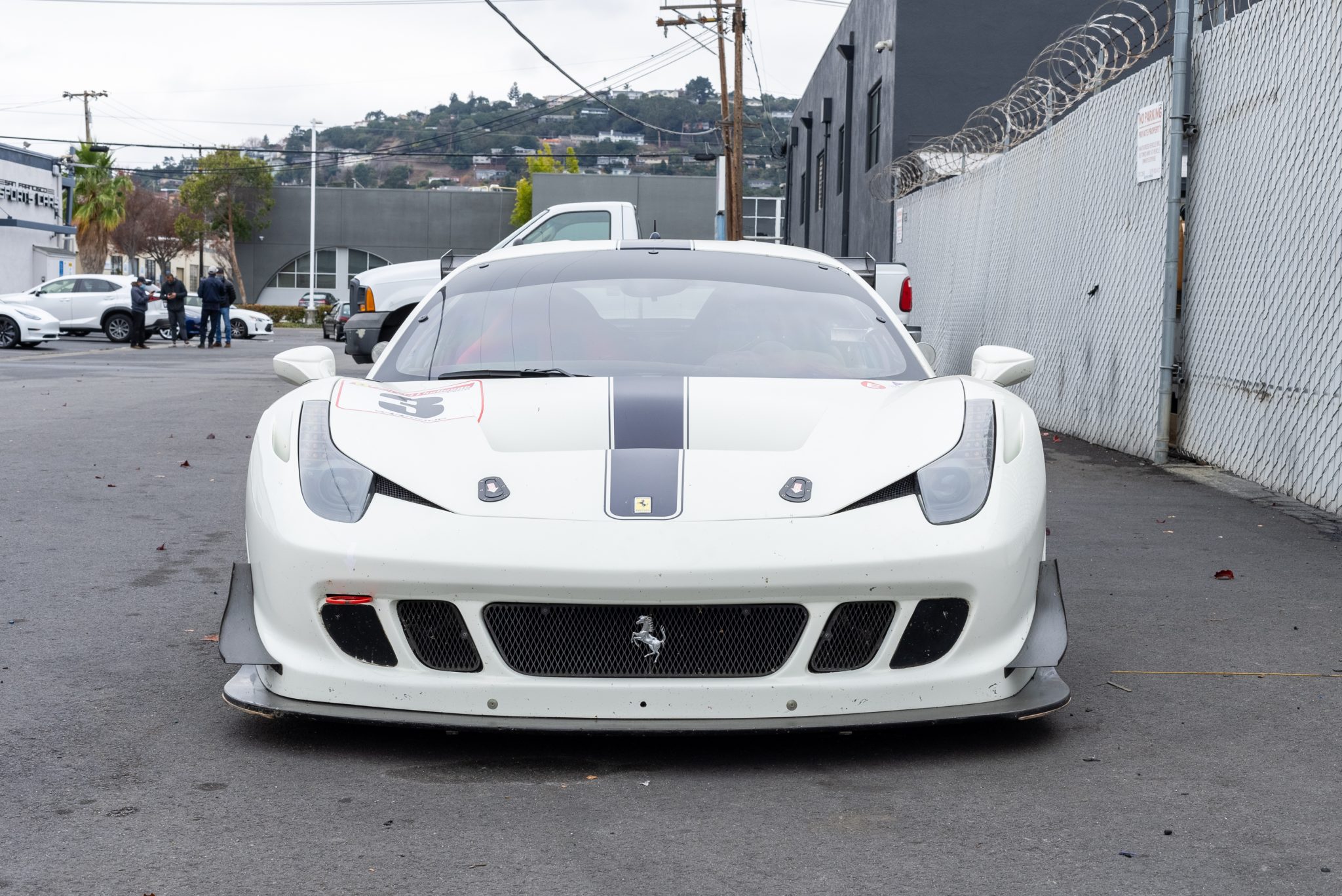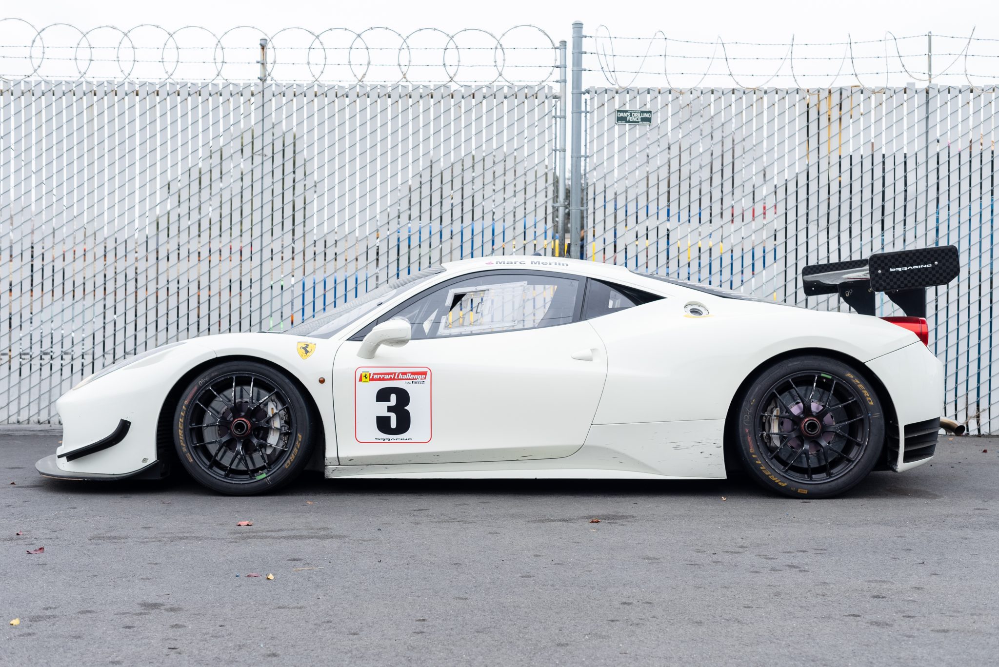 19″ BBS center-lock wheels are finished in black and are wrapped in Pirelli P Zero racing tires. Braking is handled by Brembo calipers paired with replacement slotted steel Girodisc rotors. The removed carbon-ceramic rotors are included in the sale. 458 Challenge suspension modifications include solid aluminum bushings, stiffer springs, single-rate dampers, and a 30mm-lower ride height.