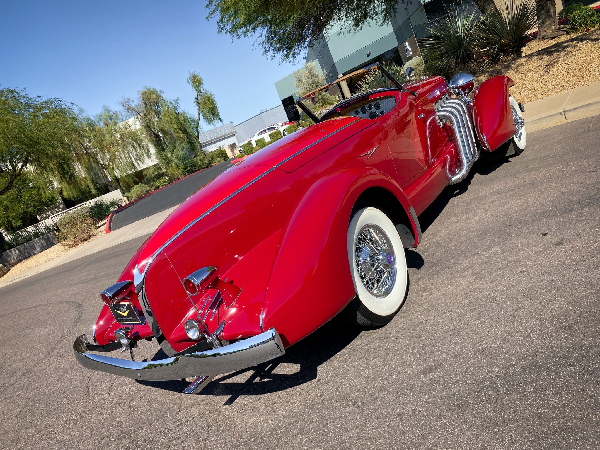 Chrome wire wheels feature knock-off hubs and are mounted with Firestone 7.00-16″ bias-ply whitewall tires. The Duesenberg II featured a custom X-frame chassis and utilized Ford Twin I-Beam front suspension along with power-assisted steering and brakes. A new brake booster and master cylinder were installed by the selling dealer in 2020. Flaws in the chrome on the wire wheels are noted.