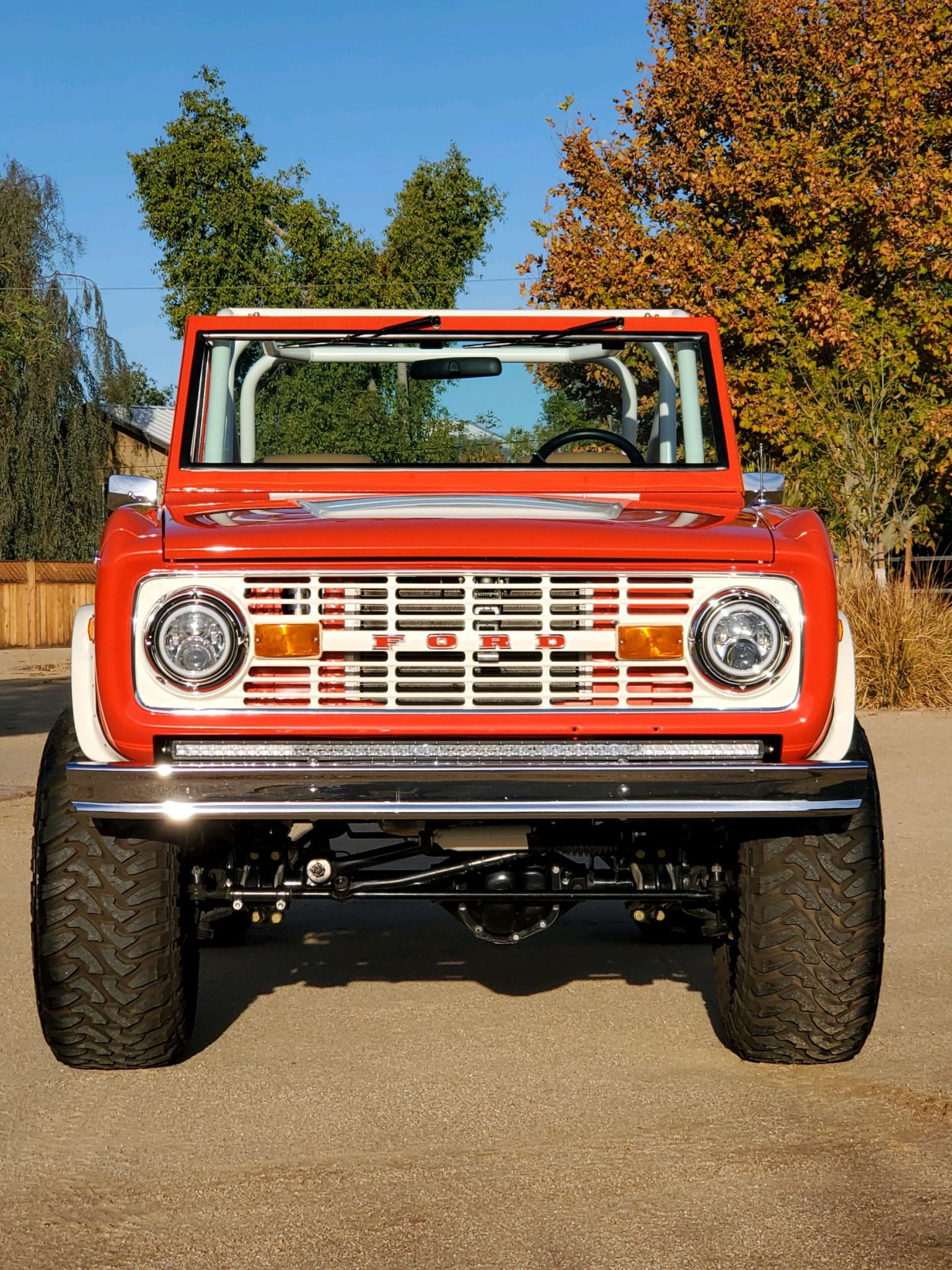Fuel Off-Road 18″ wheels feature orange detailing with simulated bead-lock rings and are mounted with 35×12.50″ Fuel Tri-Ace Mud Gripper M/T tires. Braking is handled by power-assisted four-wheel discs, and the ride height has been increased with the use of a 3½” suspension lift and a 2″ body lift. Warn locking hubs have been added to the front, and the seller states that a brake-fluid leak was repaired during a November 2020 service.