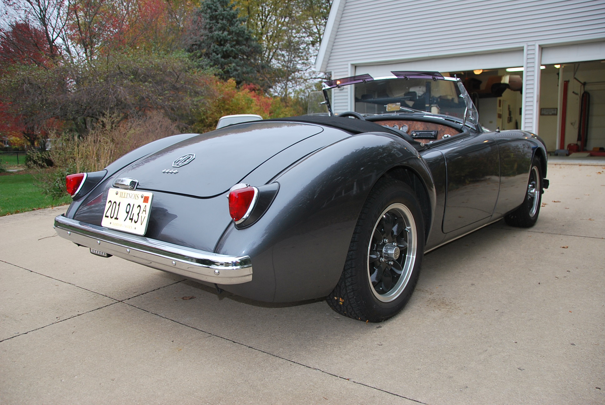 Minilite-style 15″ wheels feature black inserts, polished lips, and MG center caps, and they are mounted with Dunlop Signature tires. Suspension and braking components were sourced from an MGB and installed in 2012.