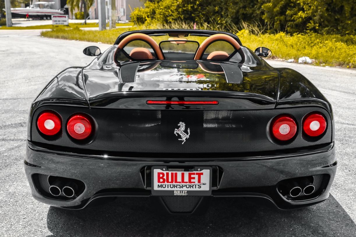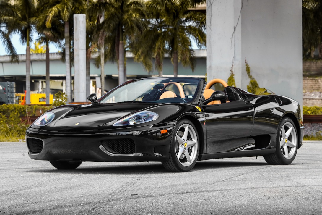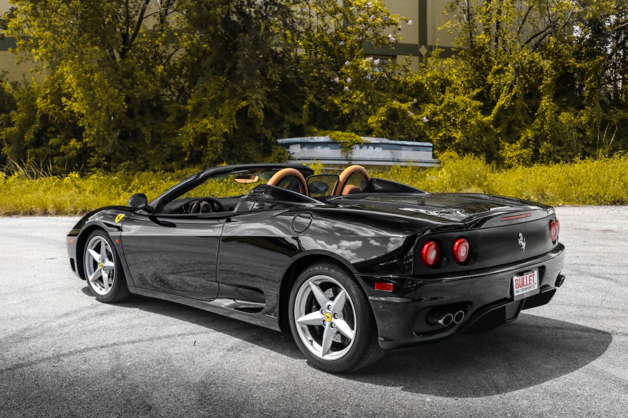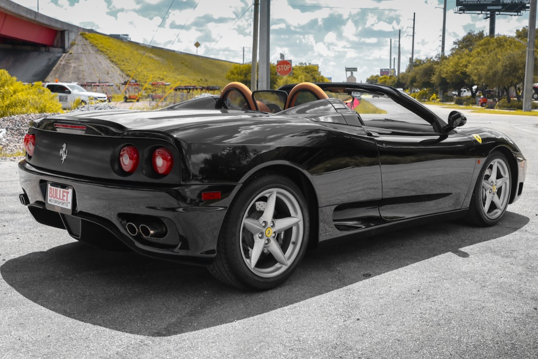 Factory 18″ alloy wheels are wrapped in staggered-width Bridgestone Potenza tires. Braking is handled by cross-drilled and ventilated discs paired with black-finished calipers with white Ferrari logos, and the suspension utilizes adjustable coilovers at all four corners. The seller notes curb damage on the right-rear wheel.