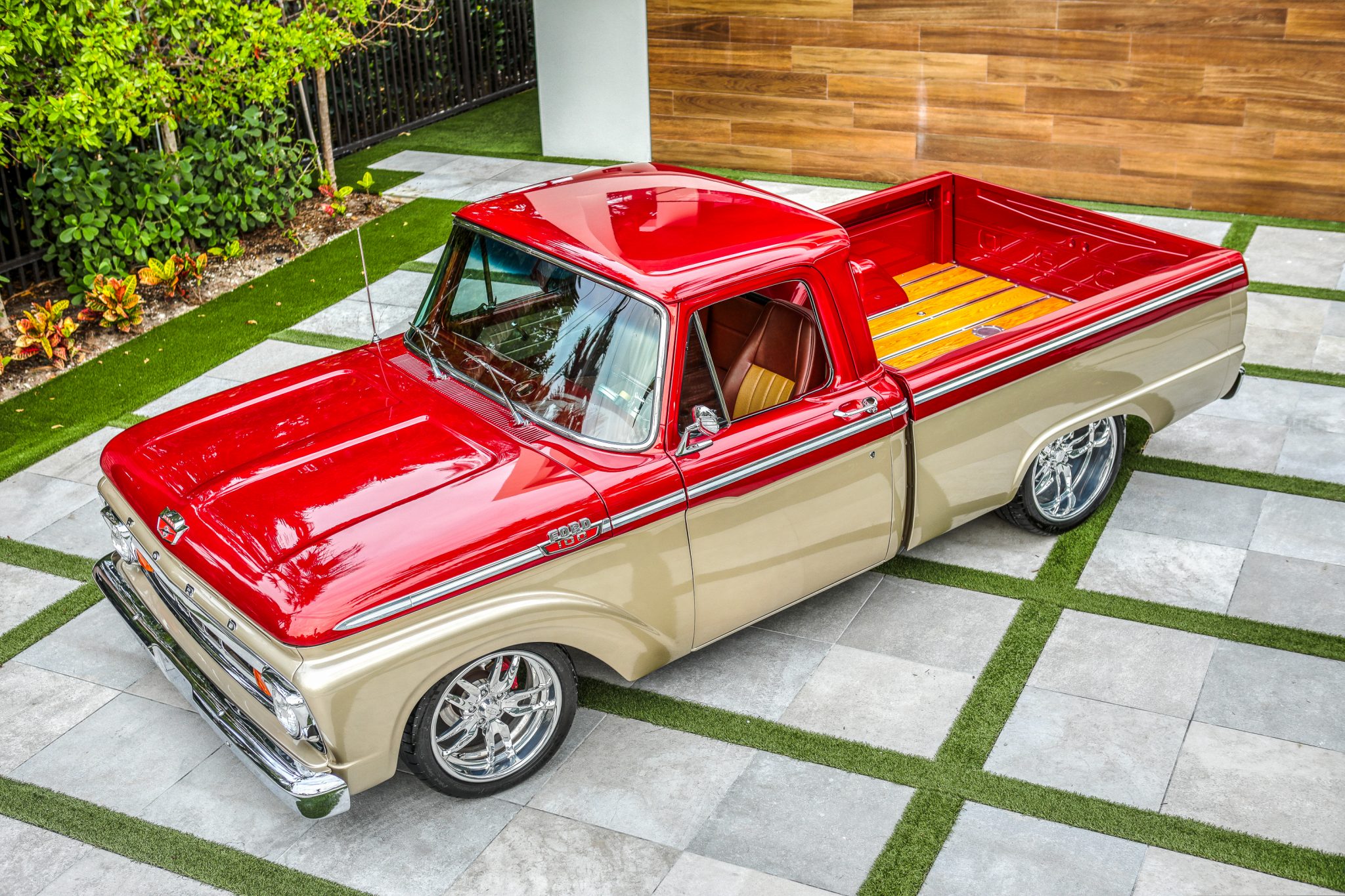 Boze forged wheels were custom-ordered and measure 18″ up front and 20″ out back and are wrapped in Michelin Pilot Super Sport tires that measure 245/40 and 335/30 respectively. The truck rides lower than stock on Fatman Fabrications Low Rider independent front suspension with coil springs up front and leafs out back. The frame has reportedly been notched, and braking is handled by 11″ General Motors front discs and Ford drums in the rear.