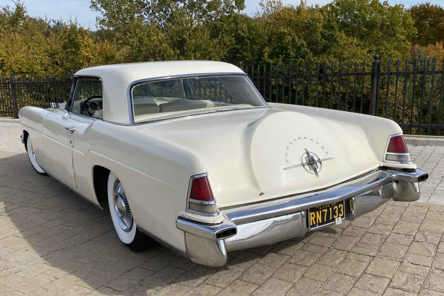 The car rides on a 126” wheelbase, and the 15” steel wheels wear refurbished chrome covers and whitewall radial tires. A full-size spare is found in the trunk, and the seller reports that the steering linkage has been replaced and the brakes are in need of service.