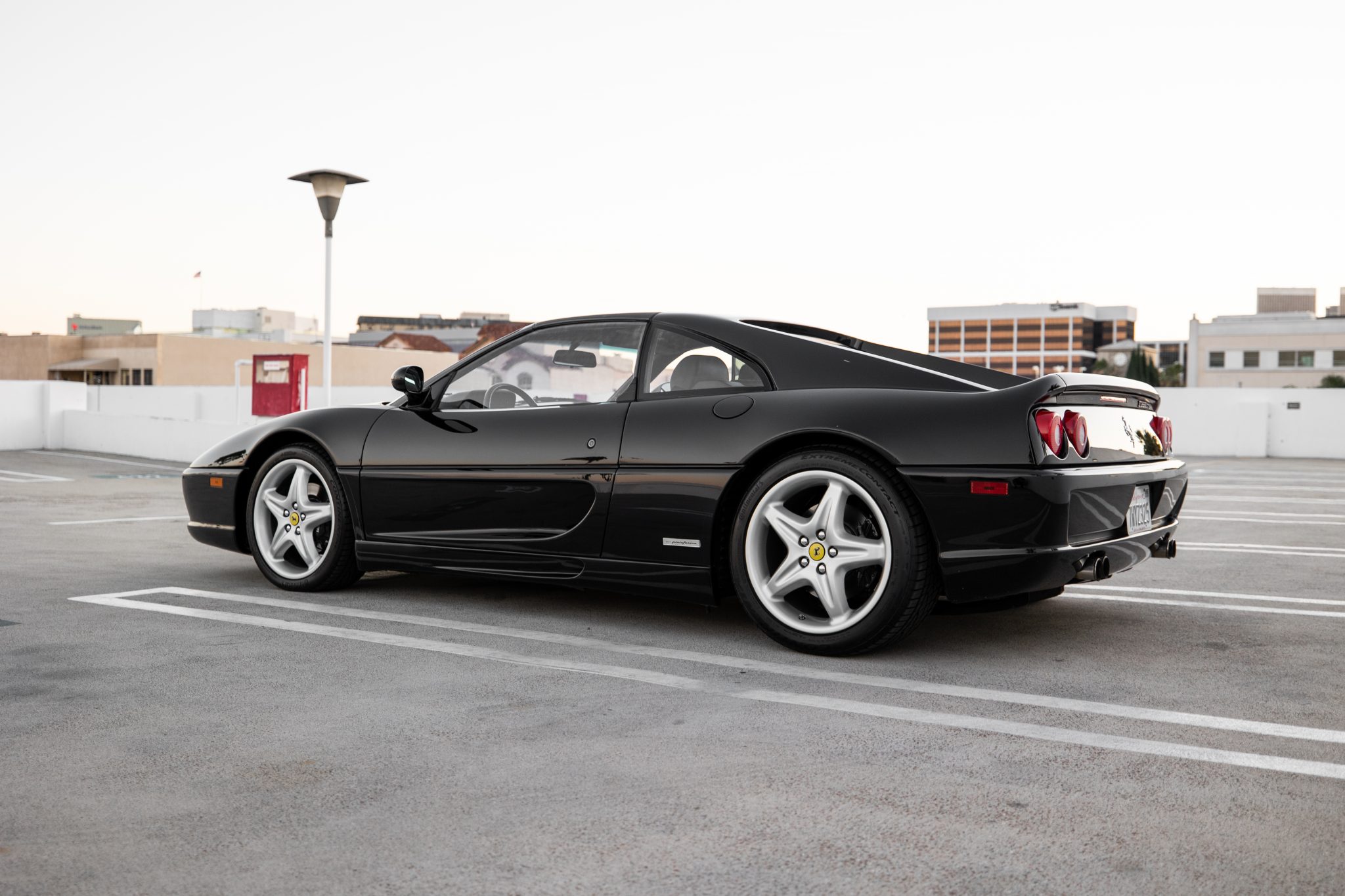 Five-spoke 18″ wheels feature yellow prancing-horse center caps and wear 225/40 front and 265/40 rear Continental ExtremeContact DWS06 tires. The four-wheel disc brakes are equipped with Ferrari-branded calipers, and the selling dealer states that the wheels have been refinished.
