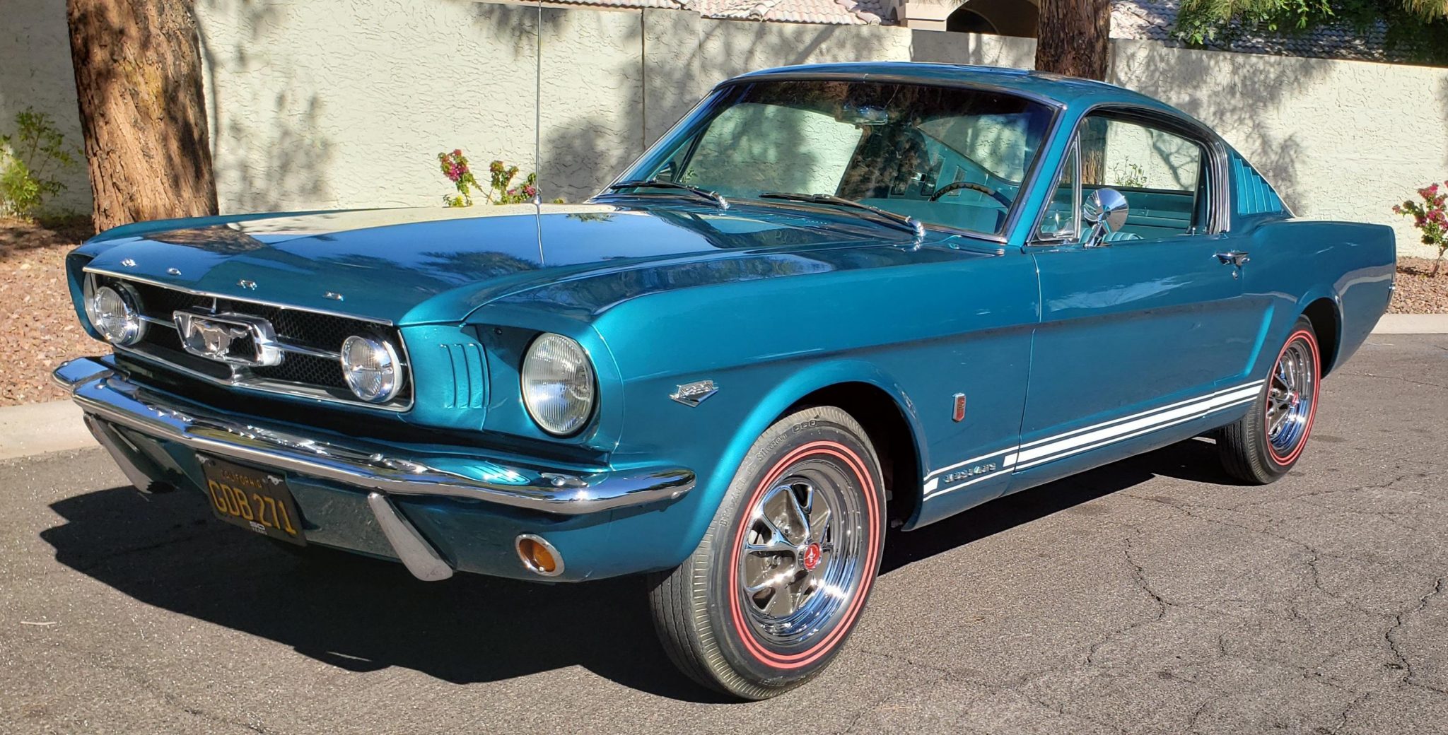 Chrome 14″ styled steel wheels wear pony center caps and BFGoodrich Silvertown redline bias-ply tires. A covered matching spare is housed in the trunk. The GT package included revised spring rates, stiffer shocks, and a thicker front sway bar from the factory when compared to the standard Mustang, as well as front disc brakes. Steering is unassisted.