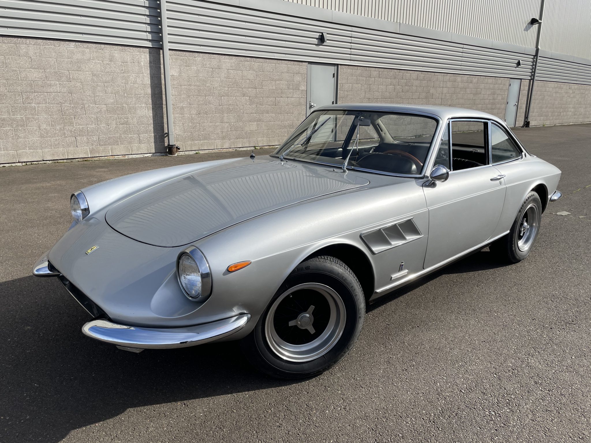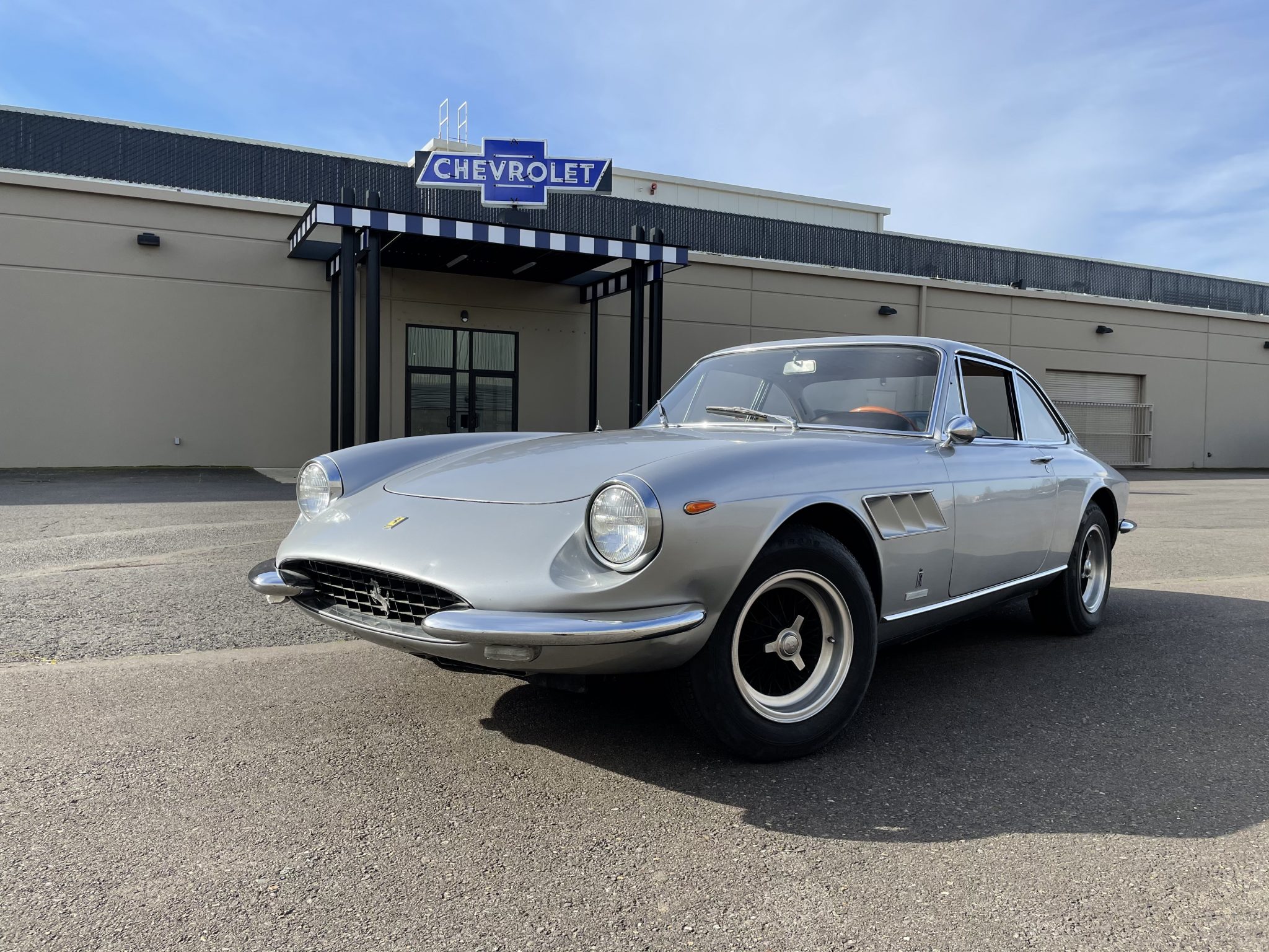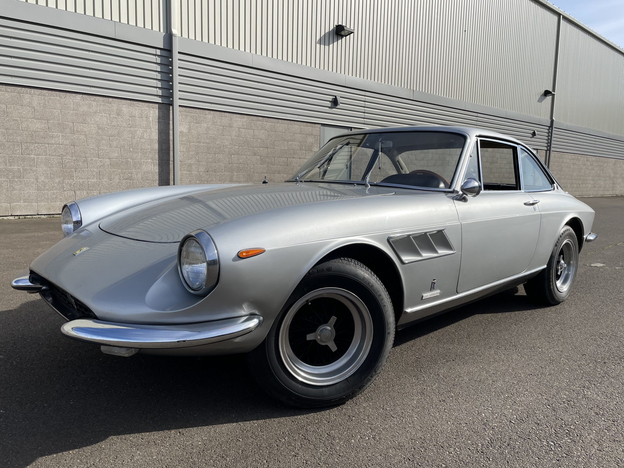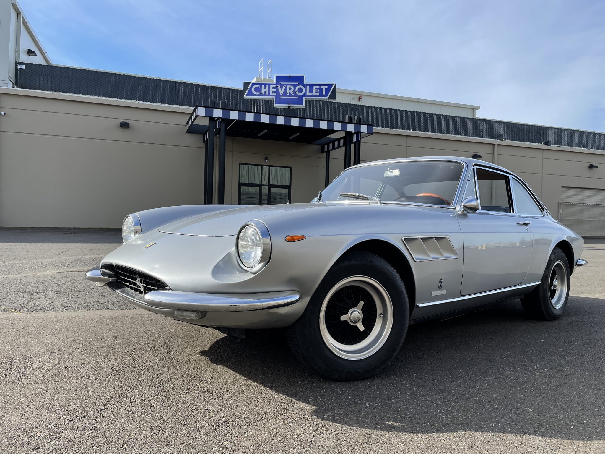 Details include a single Talbot side mirror, a power antenna, four exhaust tips, and two six-digit blue California license plates. Borrani wire wheels feature black spokes and polished rims, and are secured by three-eared knock-offs. Older Firestone FR440 tires are mounted at each corner as well as on the spare housed in the trunk. A 2021 overhaul of the power-assisted brakes included sending out the hydraulic components to be rebuilt according to the selling dealer.