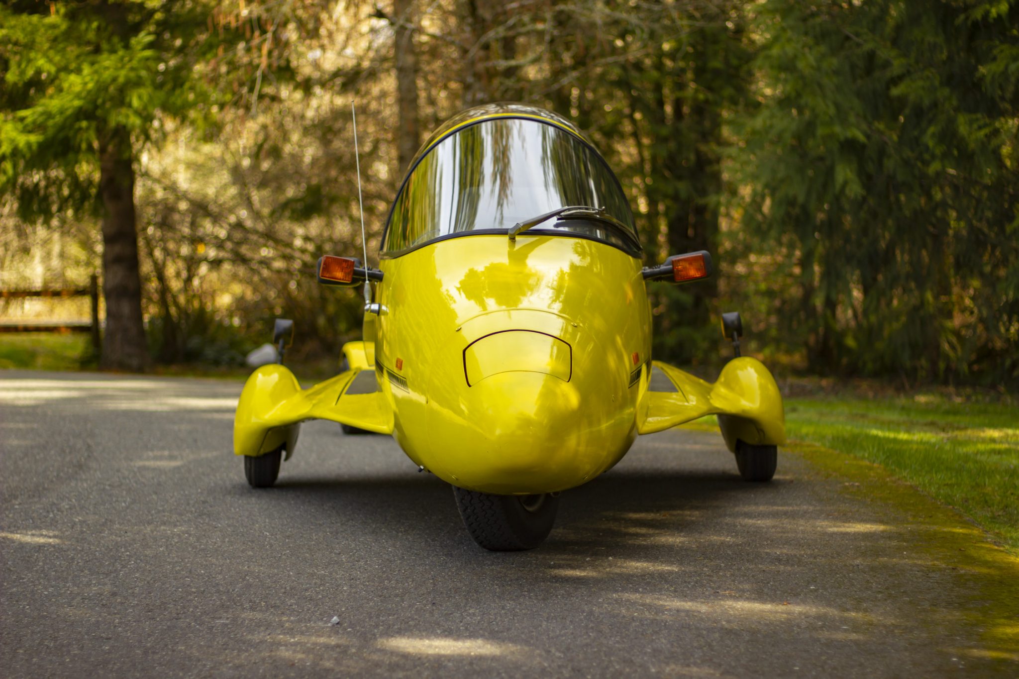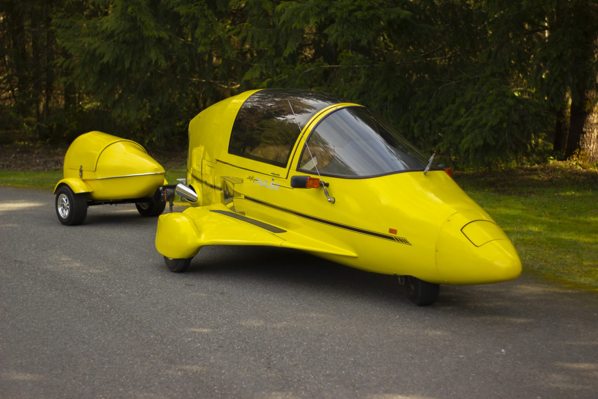 The Pulse was designed as a two-wheeled vehicle with an additional two wheels mounted to fiberglass-skirted outriggers on either side of the body. This example rides on two central 13″ wheels mounted with 155/80 Firestone WR-12 tires and joined by 4.80-8″ trailer tires on either side. The outriggers are mounted to the body with adjustable tie rods, and the suspension system consists of a spring-over design up front and a swingarm at the rear. Braking is handled by hydraulically assisted front and rear discs.
