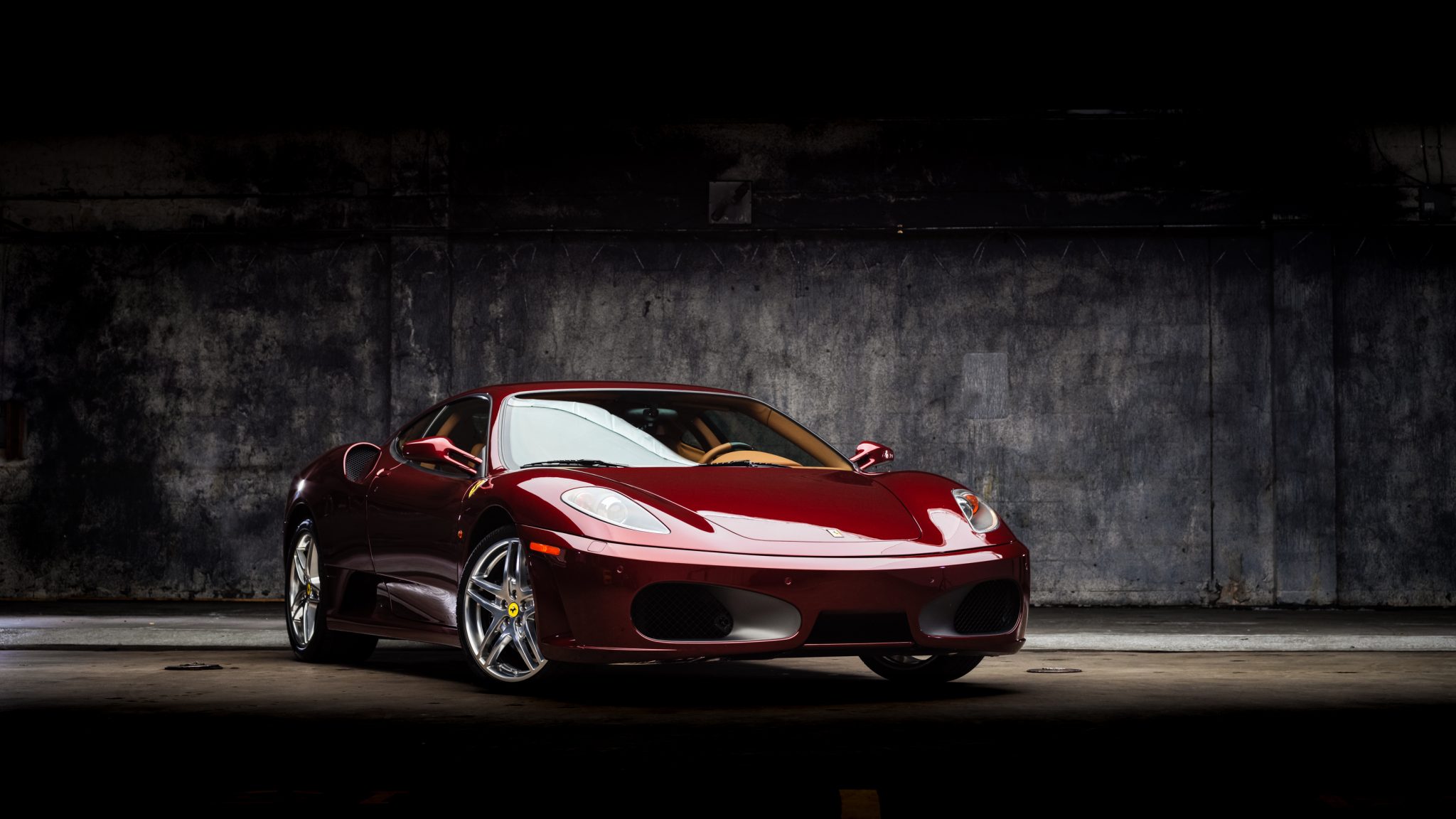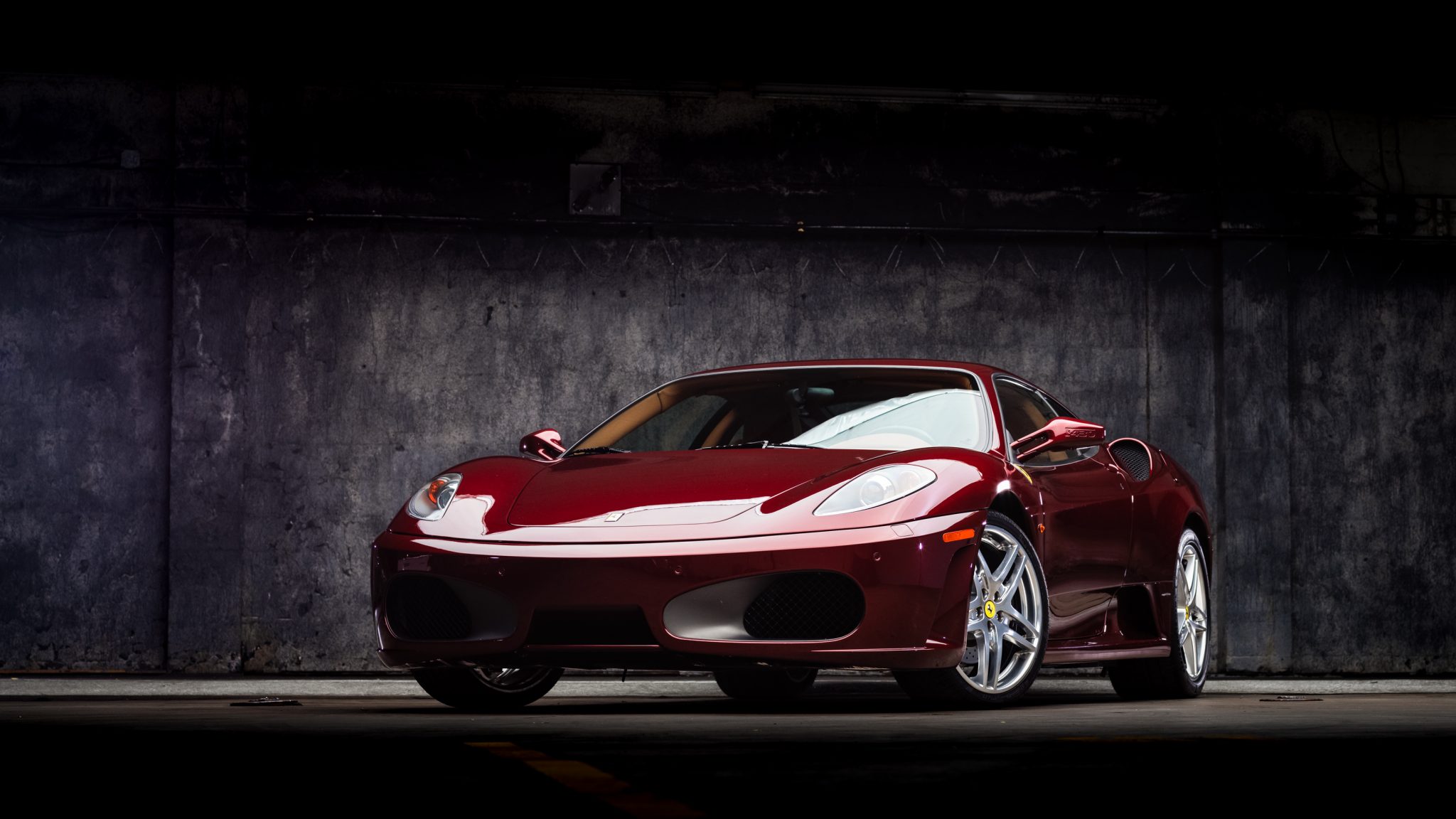 Factory ball-polished 19″ split-spoke wheels are mounted with Pirelli P Zero tires measuring 225/35 up front and 285/35 out back. Braking is from black Ferrari-logo calipers and vented cross-drilled rotors all around.