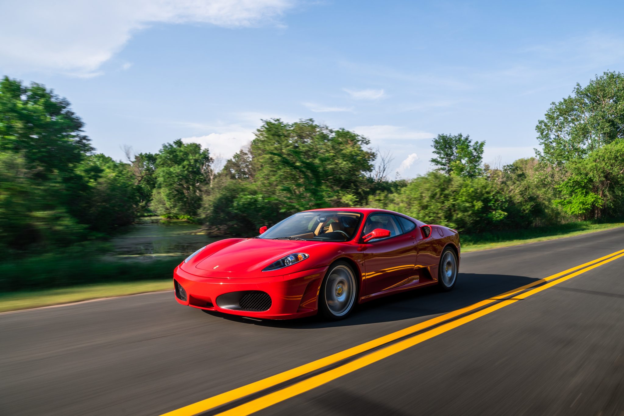Challenge-style 19” wheels wear Bridgestone Potenza RE050A tires, with the 225/35 fronts showing 2012 and 2017 date codes and the 285/35 rears dated 2009. One wheel was refinished in 2020. The braking system features black calipers over ventilated and cross-drilled rotors at all four corners. The suspension was lowered and aligned to Scuderia specifications in 2010 by The Auto Gallery in Canoga Park, California.
