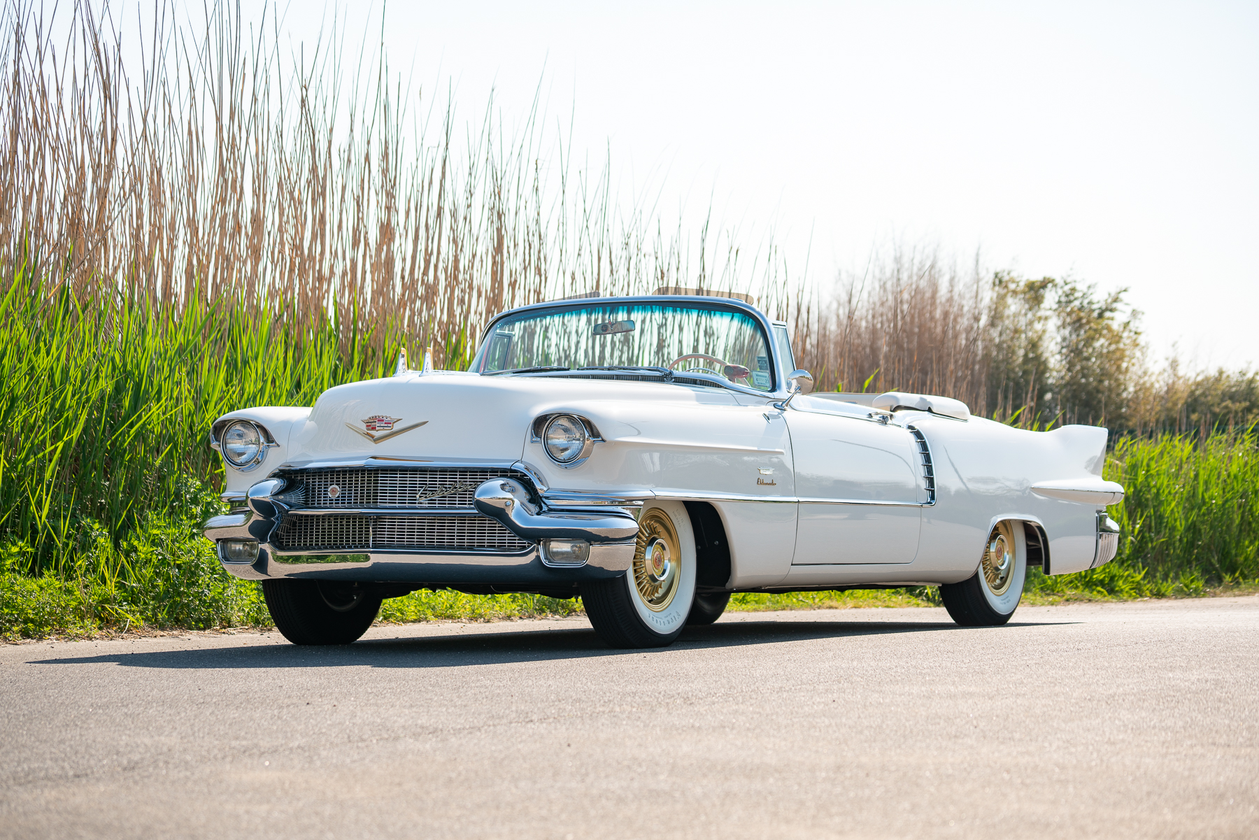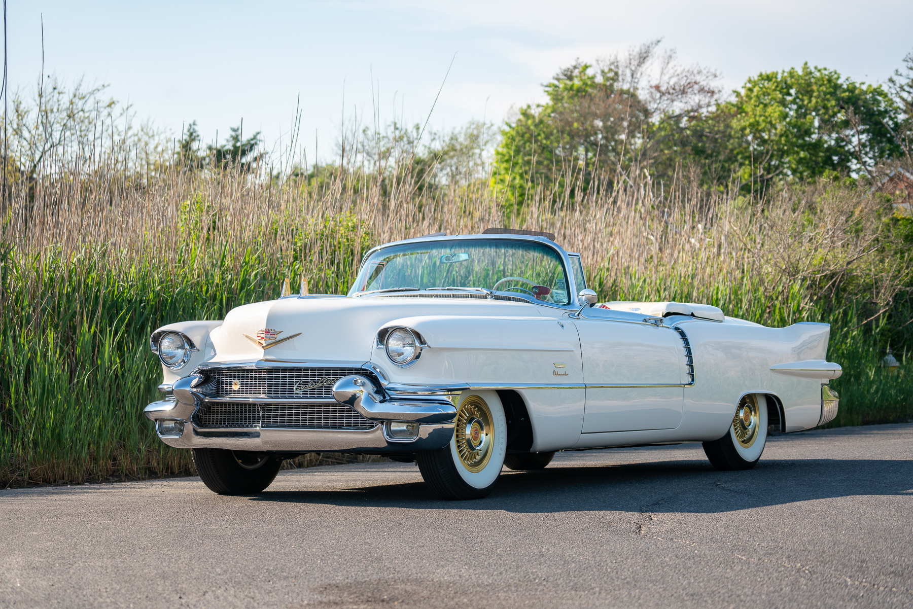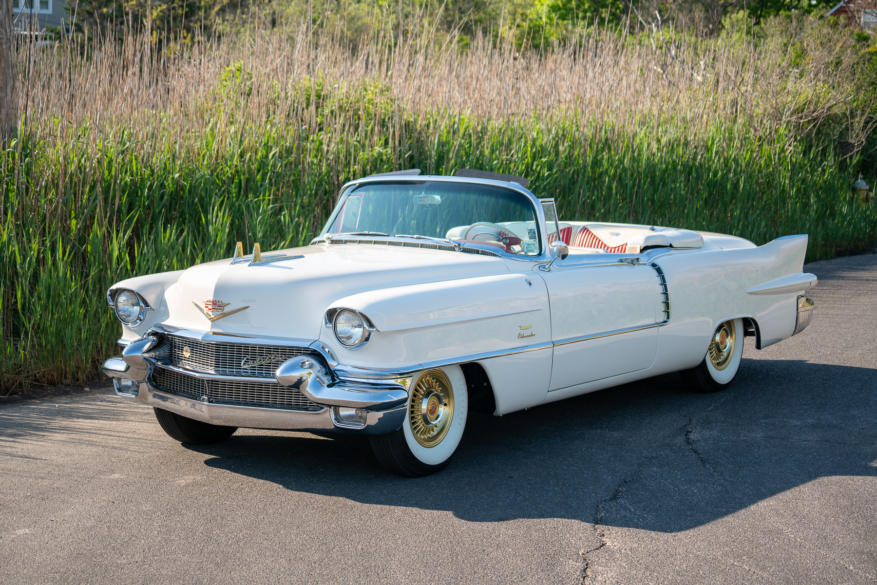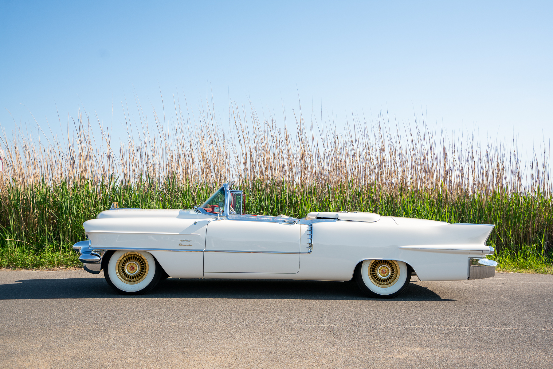 The power-operated black soft top features a plastic rear window and is stowed beneath a white top boot. The gold-colored 15″ Sabre wheels are mounted with Firestone Deluxe Champion wide-whitewall bias-ply tires. A matching spare wheel is mounted in the trunk. The Eldorado utilizes a coil-spring front suspension along with a live rear axle on semi-elliptical leaf springs. Braking is handled by power-assisted drums at all four corners.