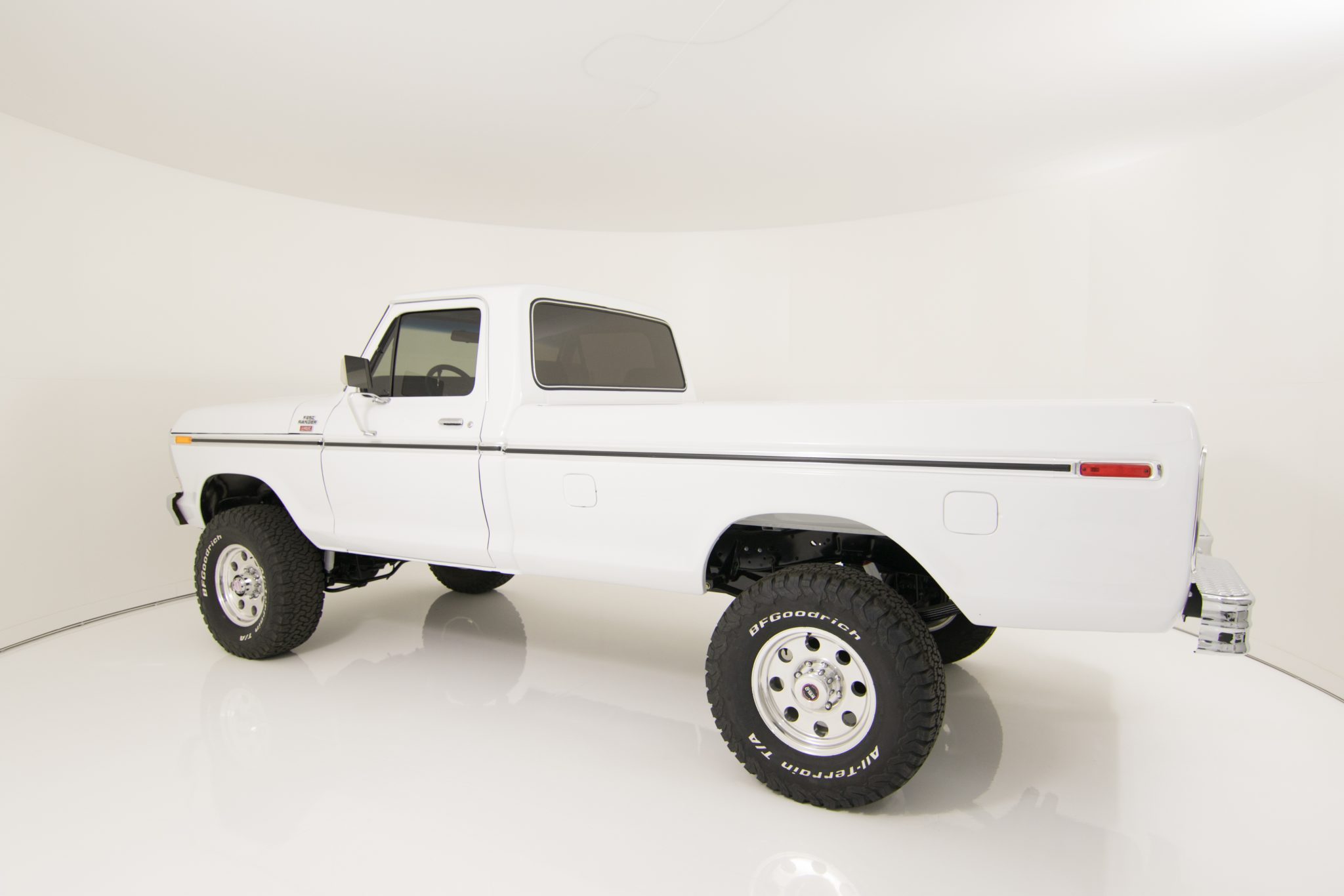Polished 17″ wheels wear Weld Racing center caps and 35×12.5″ BFGoodrich All-Terrain T/A KO2 tires. The truck is equipped with a lifted suspension, Rancho RS5000X shocks, aftermarket steering stabilizers, and manually locking front wheel hubs.