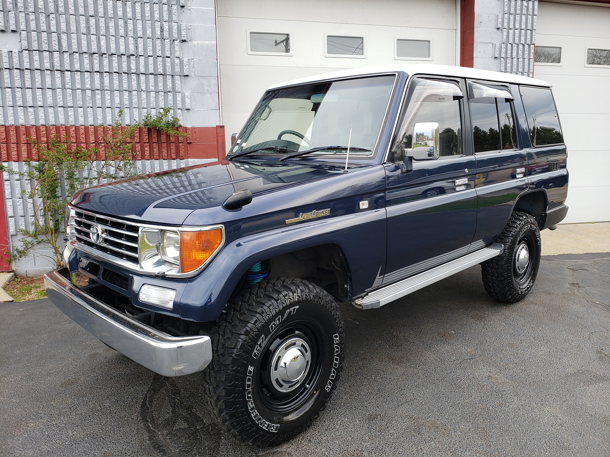 Originally finished in a two-tone scheme of Dark Blue Mica Metallic and Flaxen Mica Metallic (27Z), the body was repainted its current shade of blue with a white roof during prior ownership in Japan. A mirror has been added to the passenger-side fender, and additional features include an automatic antenna, a sunroof, headlamp washers, adjustable side mirrors, aftermarket window tint and visors, chrome bumpers and running boards, and a hitch receiver. Paint blemishes are noted by the selling dealer.