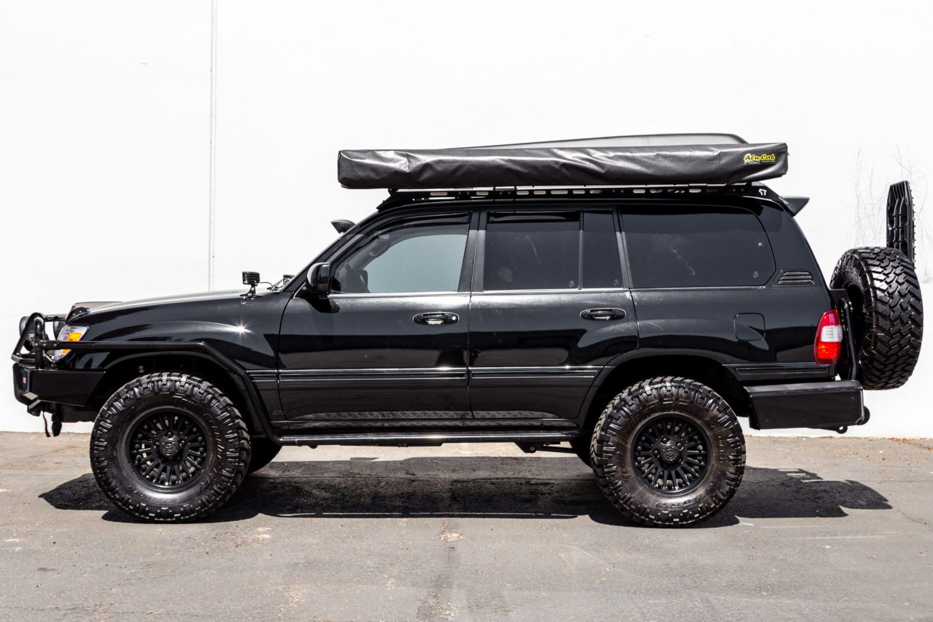 The truck has been outfitted with an Autohome Columbus roof-top tent mounted on a custom roof rack. Additional rooftop accessories include a retractable ladder, an Alu-Cab awning, and Thule crossbars.