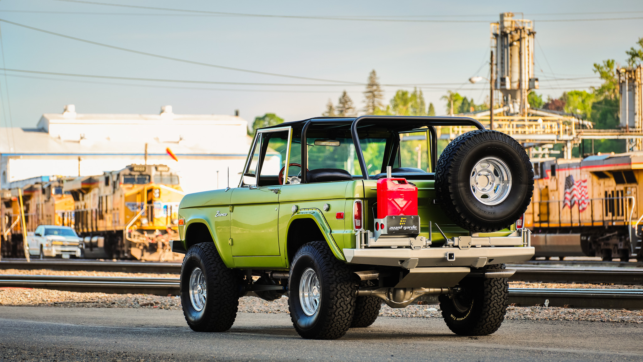 Polished 15″ Weld Racing wheels are wrapped in BFGoodrich All-Terrain KO tires sized 35×12.5″. The suspension is fitted with dual front and rear long-travel shocks and a steering stabilizer, while braking is handled by four-wheel discs.