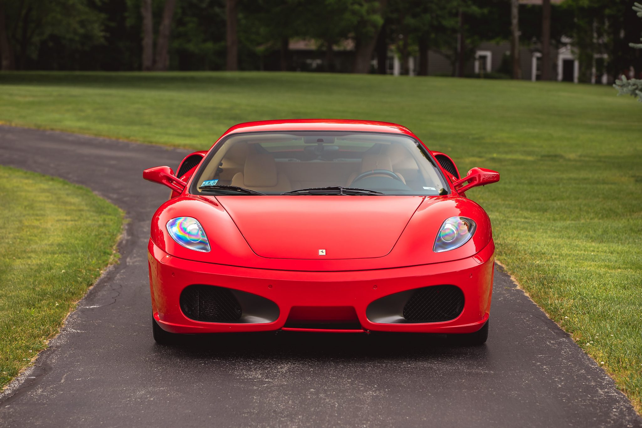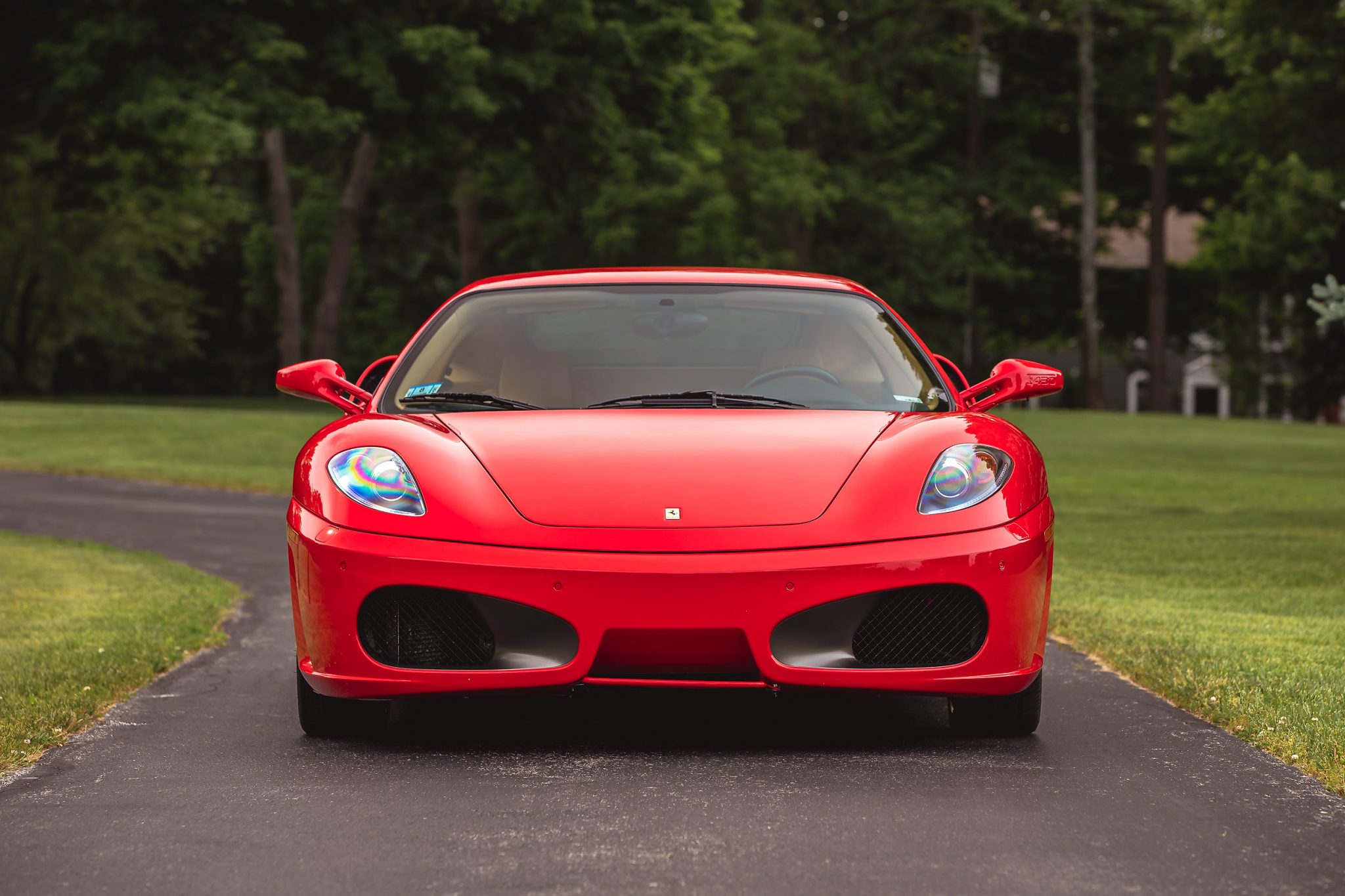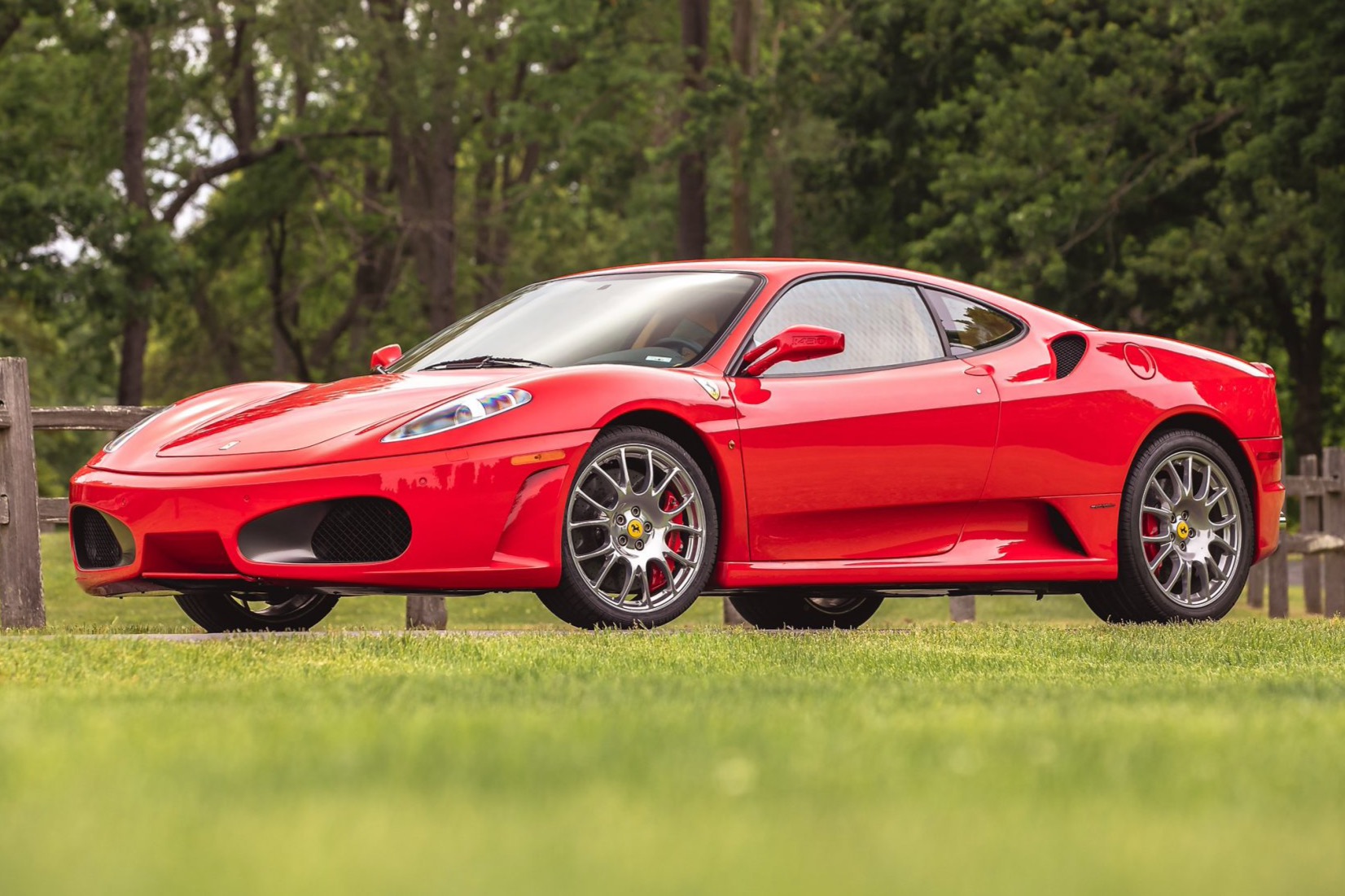 Details include Scuderia Ferrari fender shields, xenon headlights, a fiberglass rear diffuser, side intake scoops, and a front spoiler with integrated air inlets. Polished 19” Challenge-style wheels wear Pirelli P Zero Rosso tires measuring 225/35 up front and 285/35 at the rear. Carbon-ceramic disc brakes were standard equipment for the F430 beginning in 2008, and this car is optioned with red calipers.