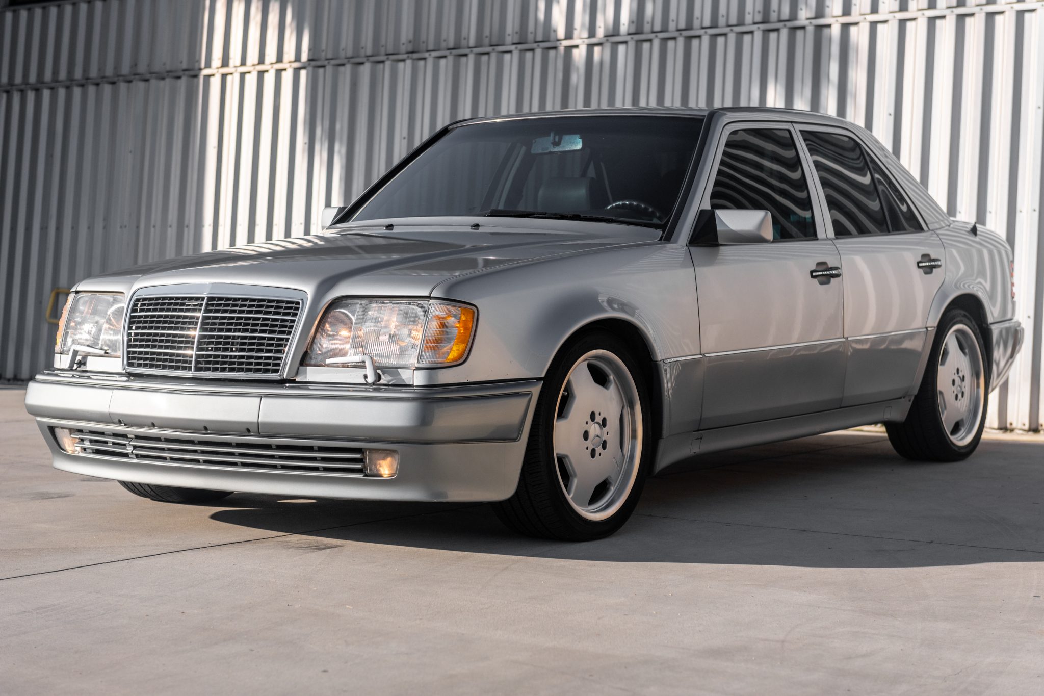AMG Monoblock 18″ wheels are wrapped in Nexen tires measuring 245/40 all around. Distinguishing features of the 500E compared with other W124 models included a wider track width, flared fender arches, larger four-wheel disc brakes, and a revised front air dam.