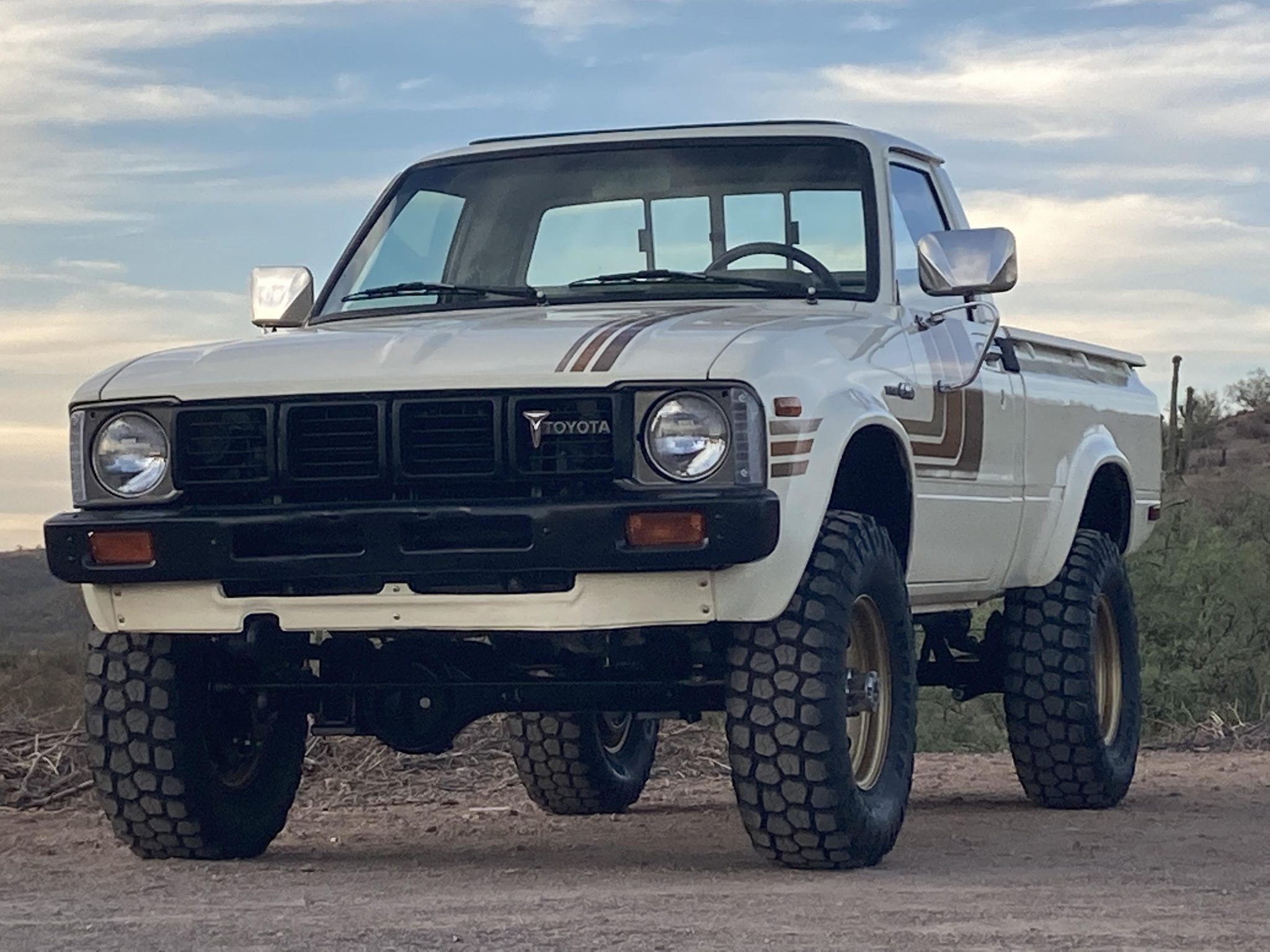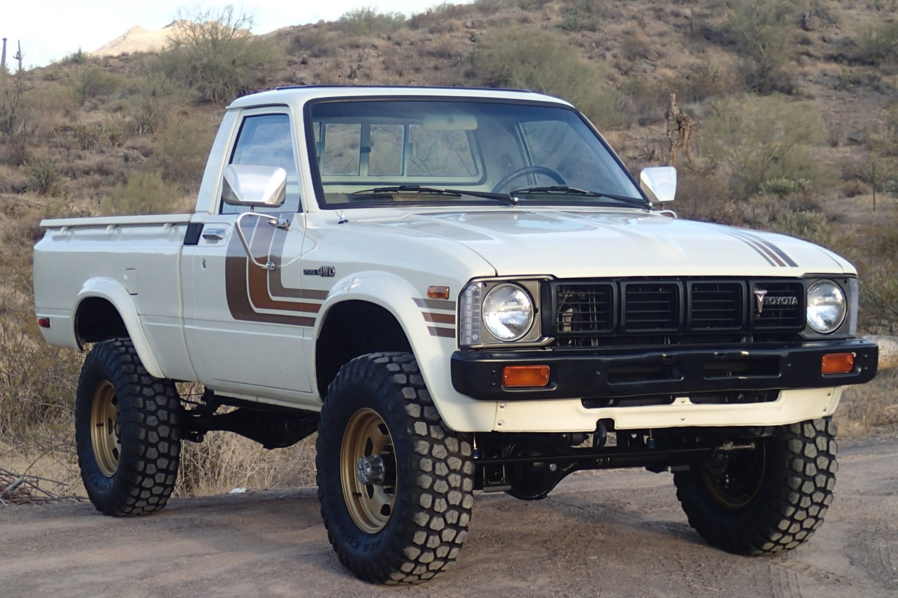 Gold-finished 15″ wheels wear Ironman Country mud-terrain tires. The truck is equipped with manually locking front hubs, and suspension consists of solid front and rear axles with leaf springs. Braking is handled by power-assisted front discs and rear drums.