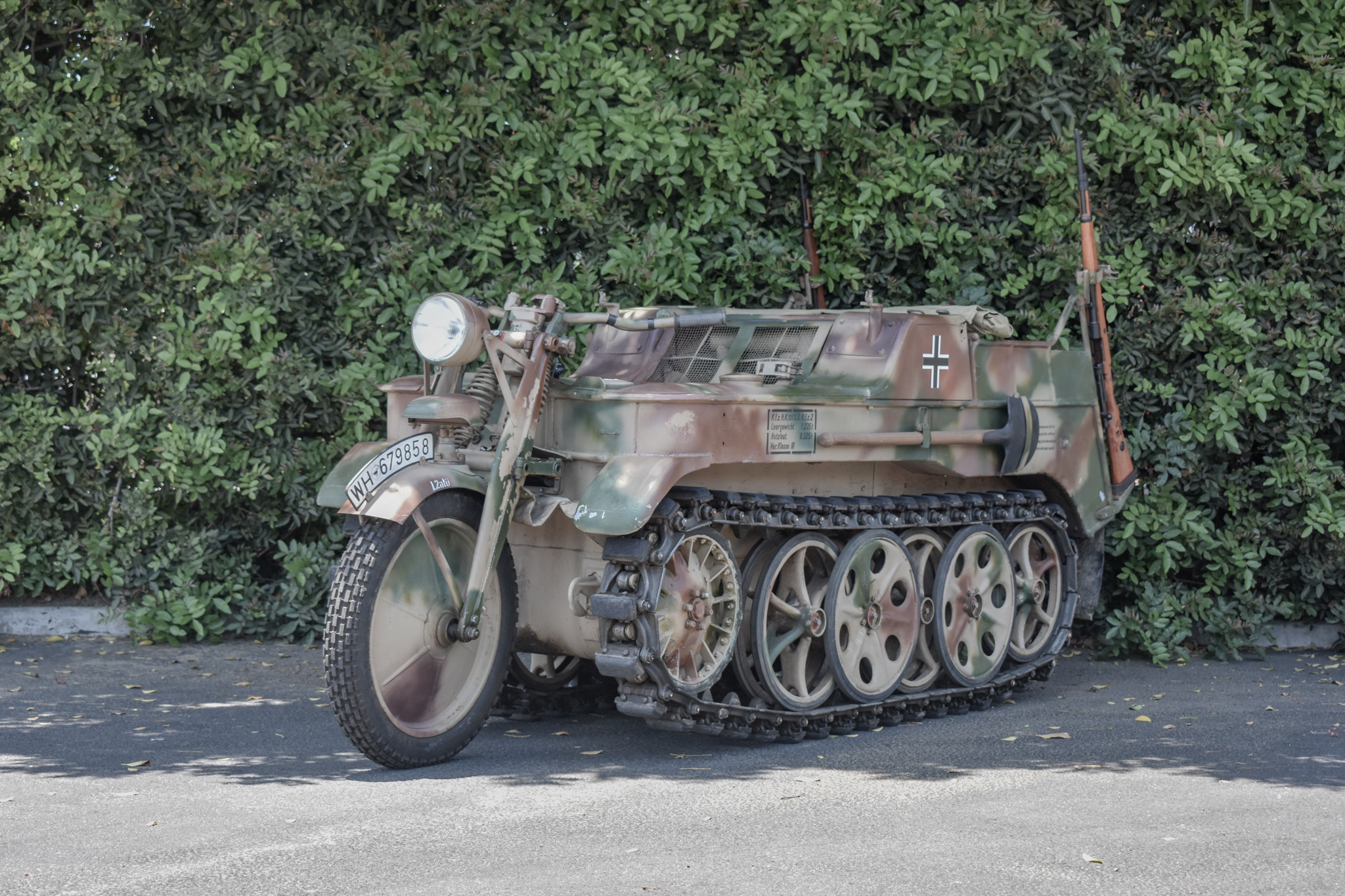This example was repainted in its current camouflage scheme under previous ownership and features German military stenciling as well as front fender-mounted and rear number plates. Additional equipment includes a trailer hitch, a canvas rear cover, blackout taillights, a shovel and axe, and bolt-action display rifles.