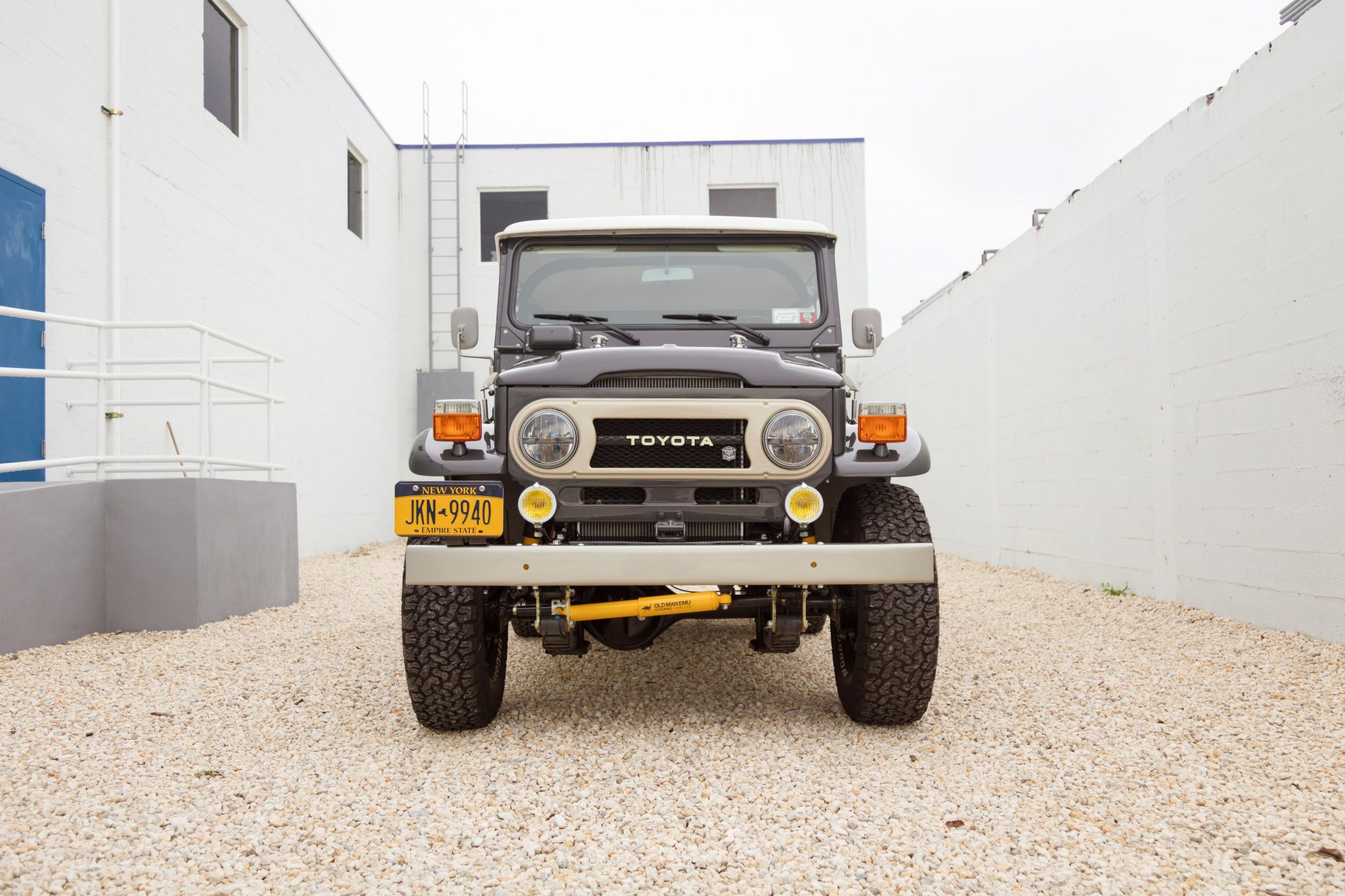 Black-finished 15” steel wheels wear polished hubcaps and are mounted with 33” BFGoodrich All-Terrain tires. An Old Man Emu steering stabilizer and nitrocharger Sport shocks have been added, along with updated power steering from an FJ60.