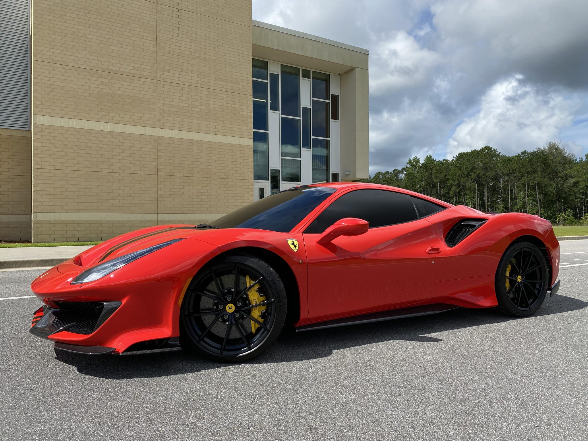 Black-finished 20″ forged wheels wear Ferrari center caps and are mounted with 245/35 front and 305/30 rear Michelin Pilot Super Sport Cup 2 tires. The car is equipped with SCM-E magnetorheological suspension control, as well as a vehicle lift system for increased ground clearance. Stopping power is provided by yellow-finished Brembo calipers clamping carbon-ceramic brake rotors.