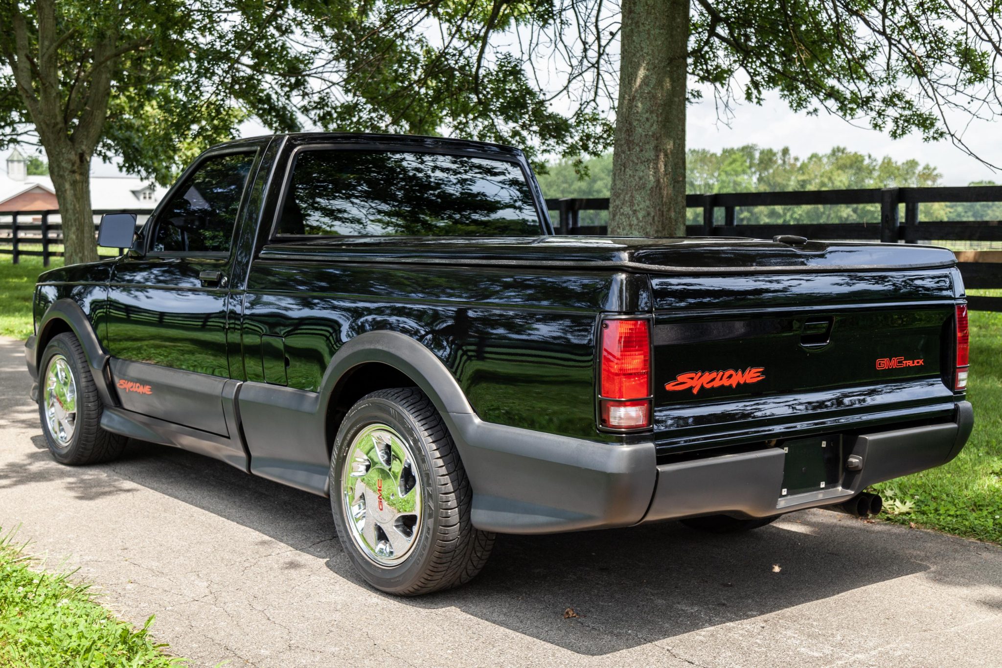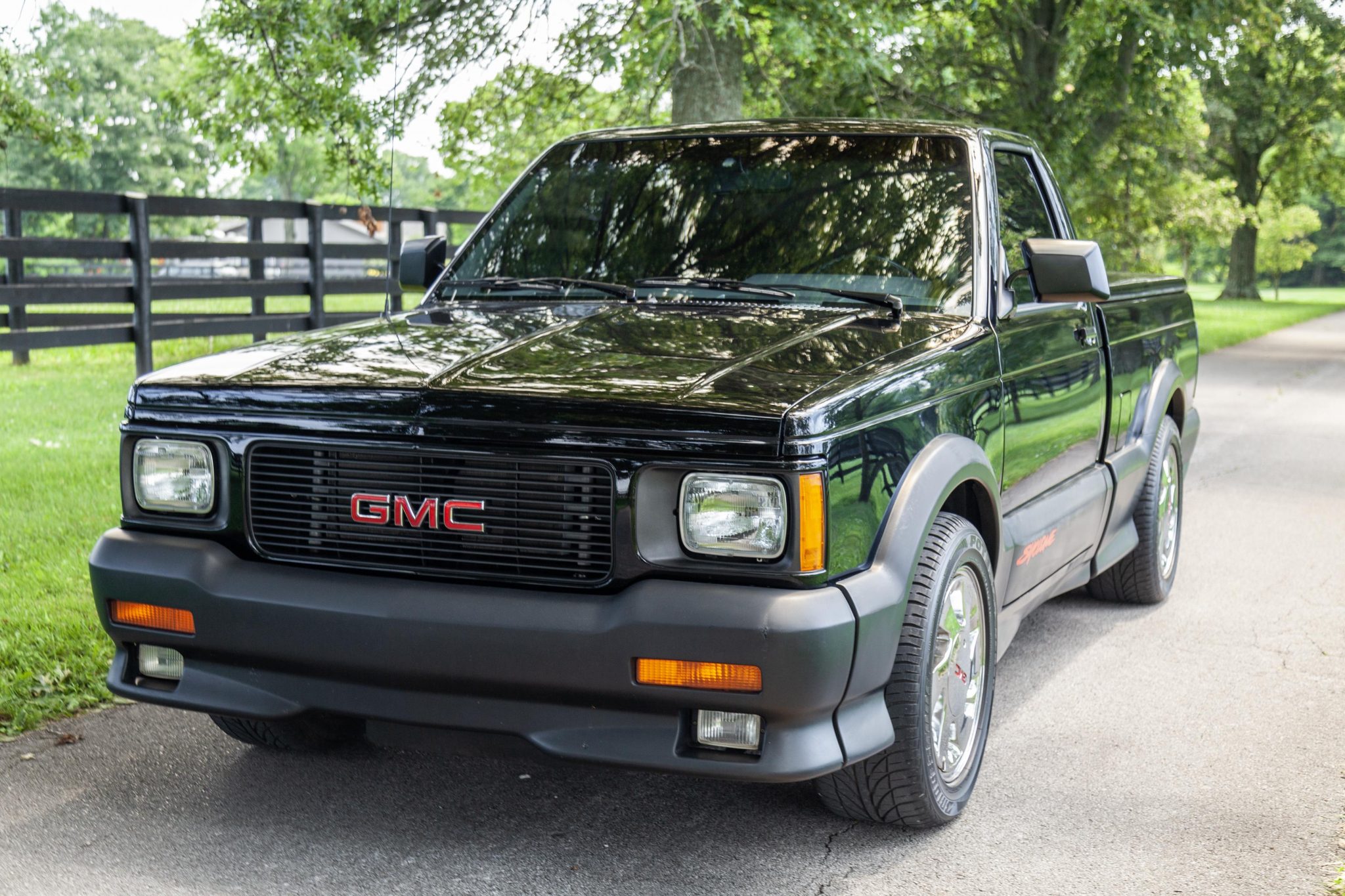 Chrome 16″ wheels wear GMC center caps are wrapped in 245/50 Bridgestone Potenza RE950 tires. Bilstein shocks have been installed, and braking is handled by cross-drilled rotors up front with drums in the rear.
