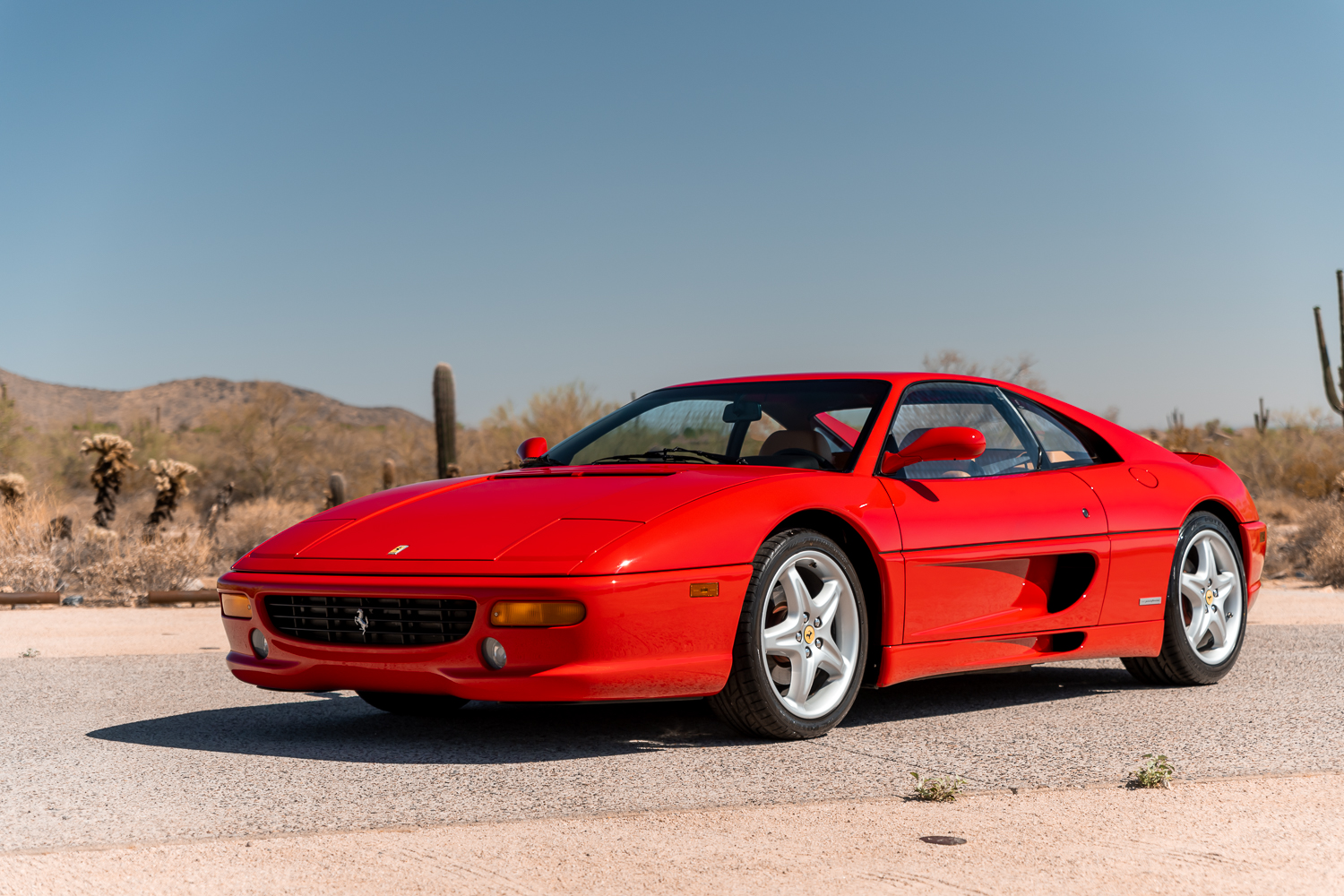 Factory 18″ five-spoke alloys wear 225/40 front and 265/40 rear Bridgestone Potenza tires. The braking system features black calipers with white Ferrari script and vented discs at all four corners.