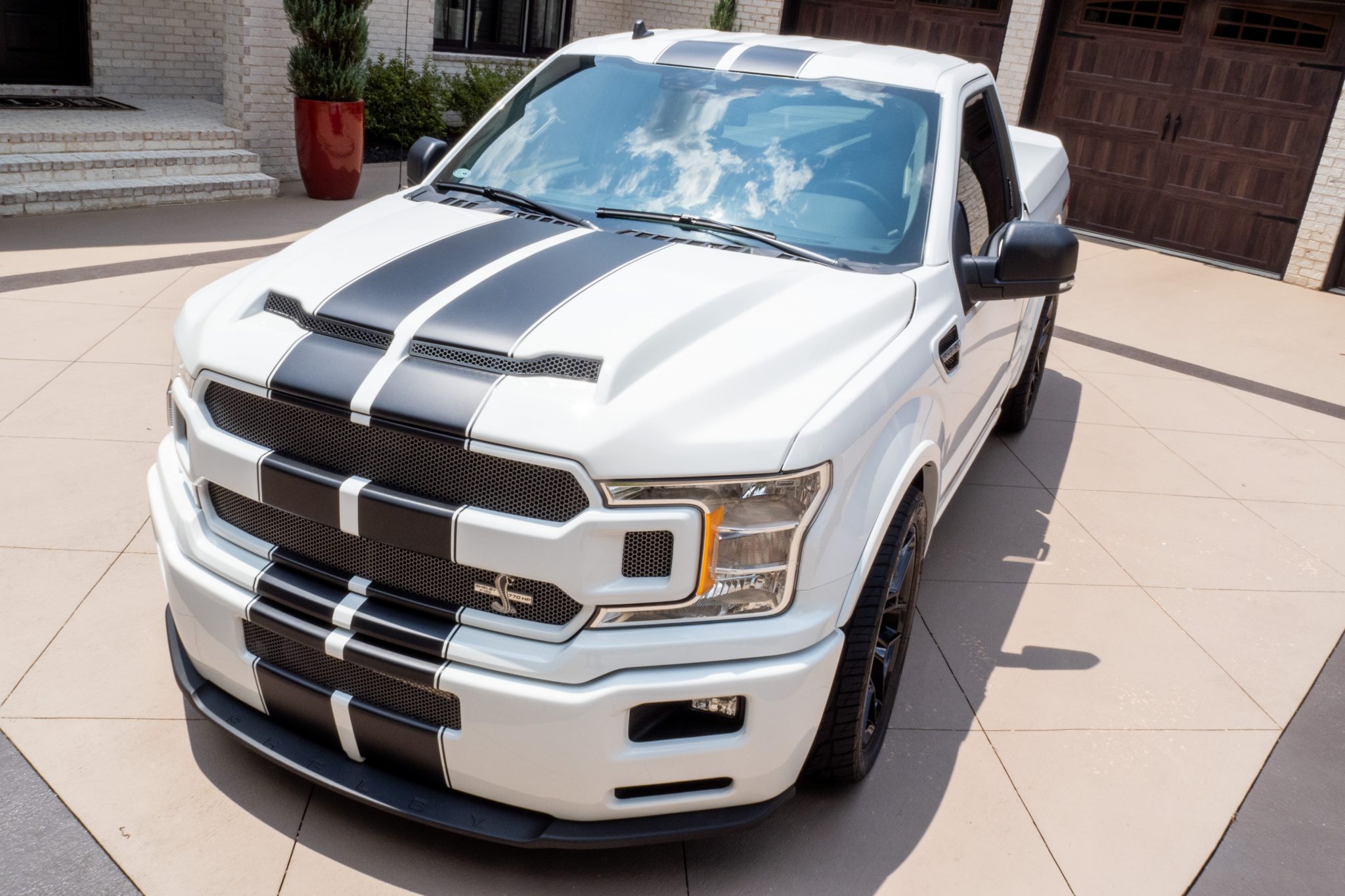 Black 22″ wheels wear Shelby center caps and 305/40 Toyo Proxes ST III tires. Shelby added a lowered Stage 3 racing suspension that included adjustable upper control arms, cam alignment lower control arms, Shelby-tuned performance front coilovers and rear shocks, a rear leaf-spring shackle kit, and an adjustable rear sway bar. Braking is handled by Baer six-piston calipers in the front and Shelby-branded calipers in the rear along with slotted rotors at all four corners.