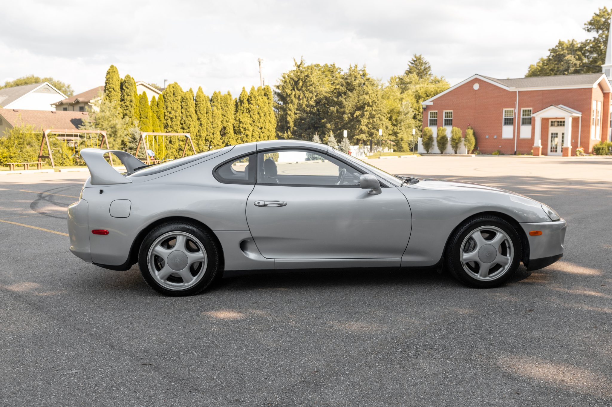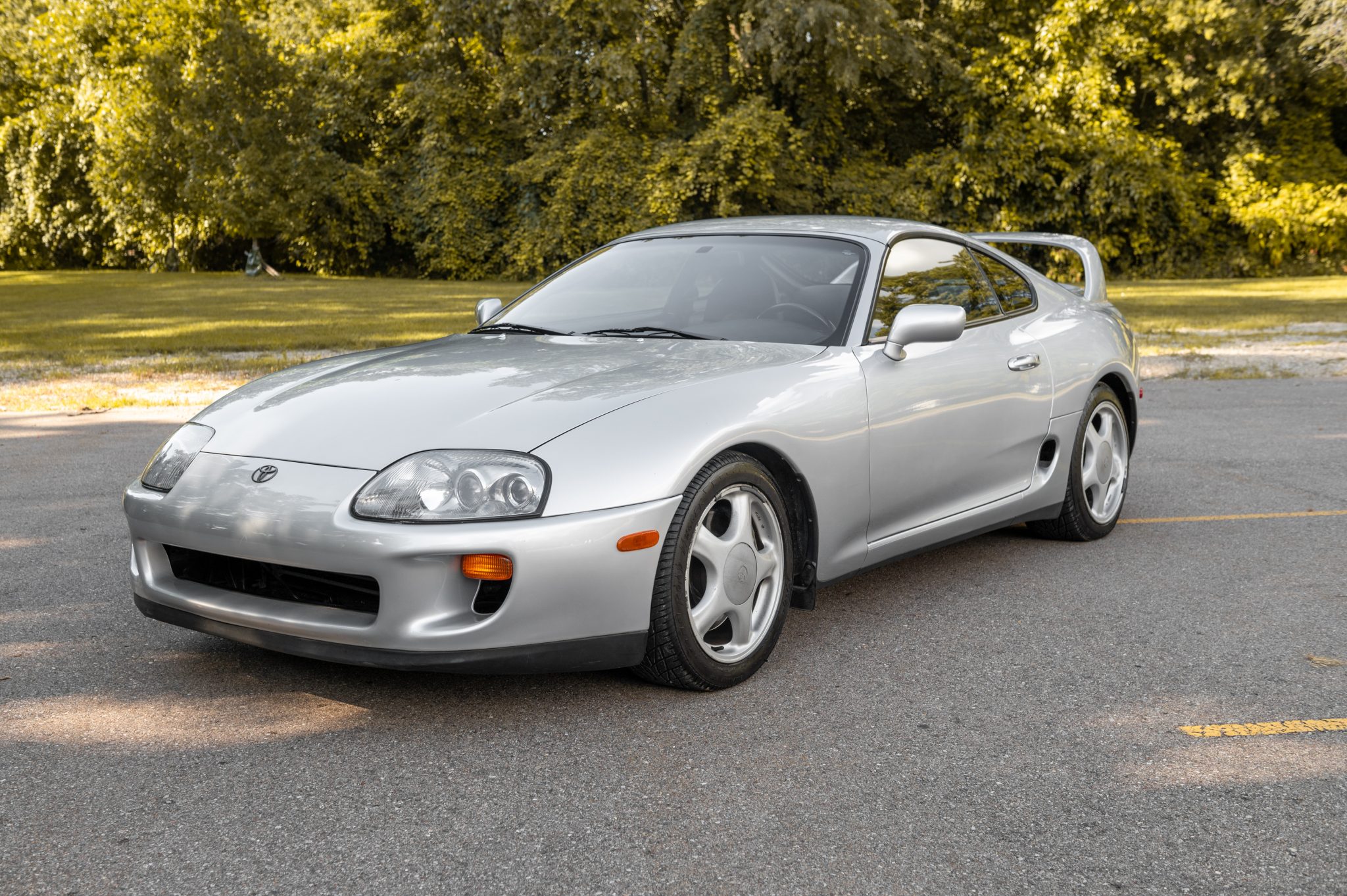Silver 17″ alloy wheels wear 235/45 Road Hugger Rage tires tires that need to be replaced due to old age. Braking is handled by four-wheel discs fitted with Supra-script calipers. Curb rash and blemishes are present on the wheels.