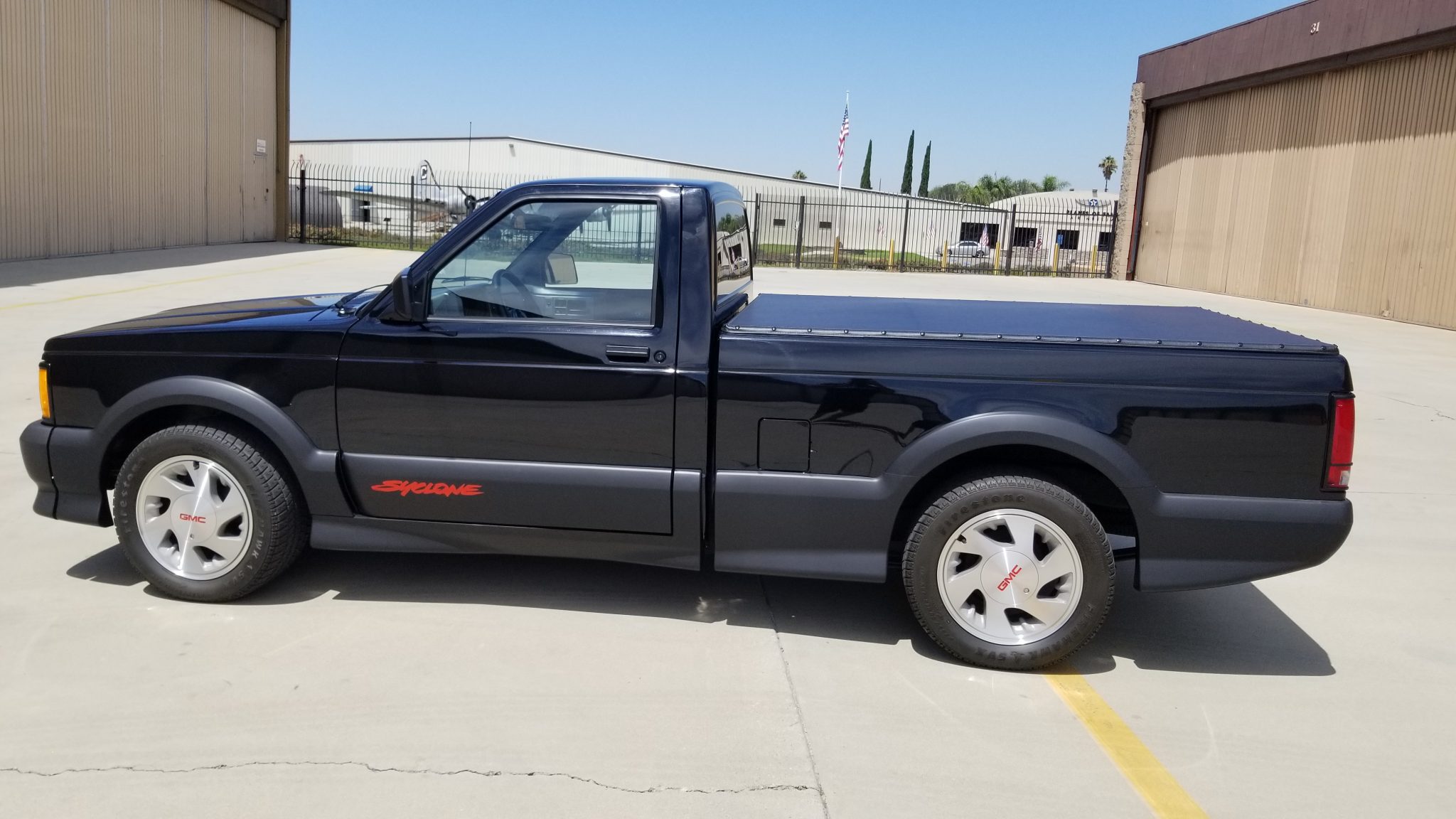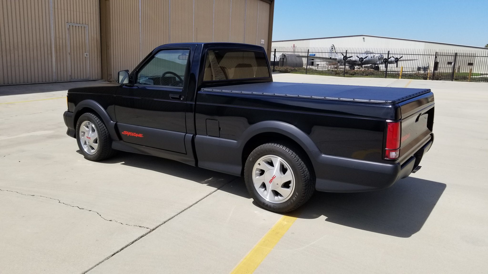 Factory 16″ alloy wheels wear GMC-branded center caps and are mounted with 245/50 Firestone Firehawk SVX tires. Bilstein shocks are fitted, and braking is handled by front discs and rear drums.