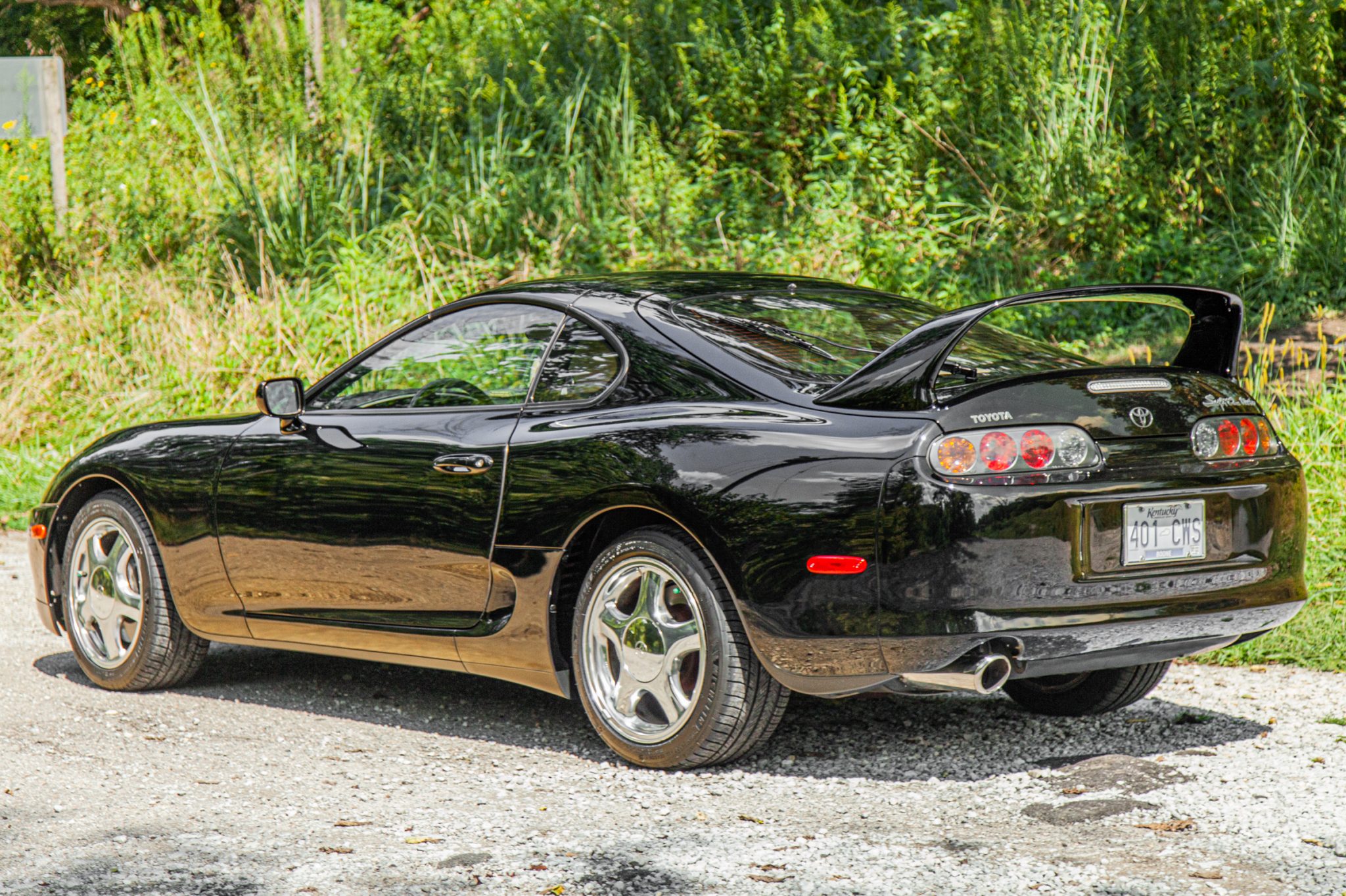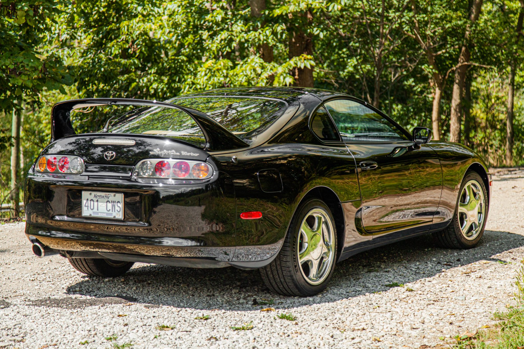Bright-finished 17″ five-spoke aluminum wheels wear 235/45 front and 255/40 rear Michelin Pilot Sport All Season 4 tires that were mounted in November 2020. Braking is handled by power-assisted four-wheel discs with Supra-branded calipers.