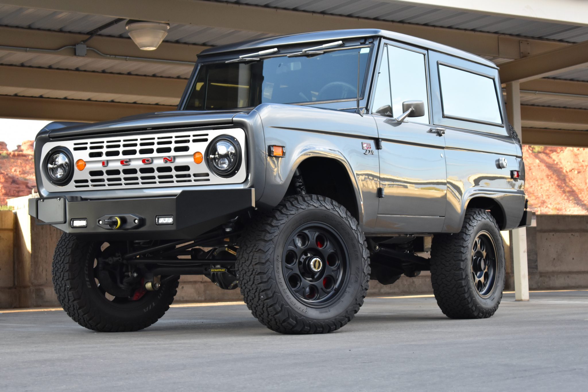 Satin black 18” wheels are wrapped in 285/65 BFGoodrich All-Terrain T/A tires. Braking is provided by Brembo multi-piston red calipers over slotted rotors at all four corners, and the truck is equipped with a Fox Racing sport suspension.