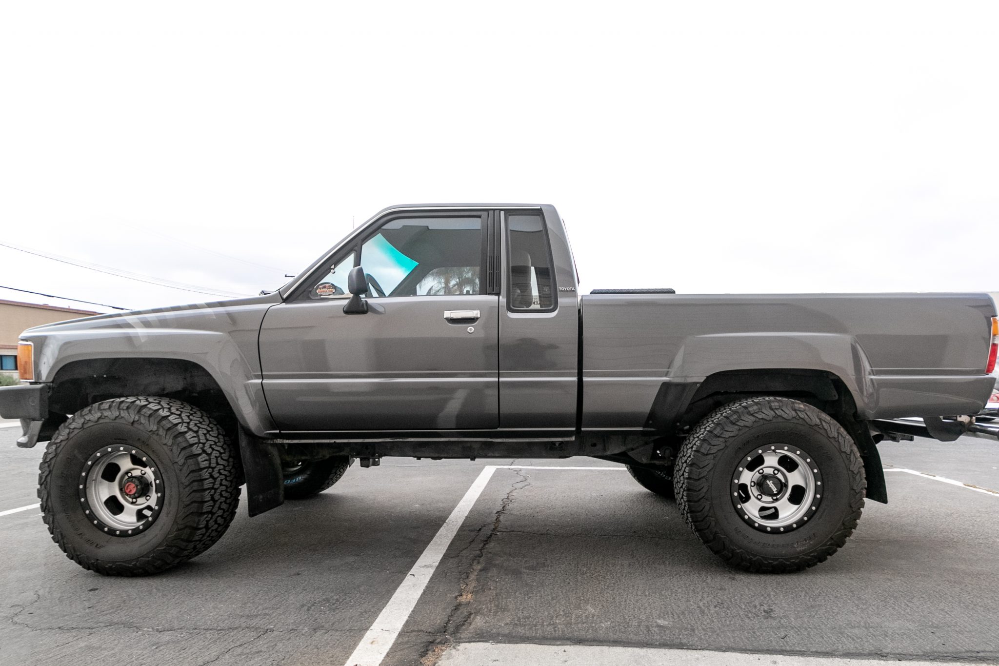 Silver-finished 15″ American Racing wheels are mounted with 33×12.5″ BFGoodrich All-Terrain tires. The front axle is equipped with Aisin manually-locking hubs, and the suspension features Bilstein shocks. The braking system has been modified with installation of a Hydroboost brake booster and Wilwood disc brakes.