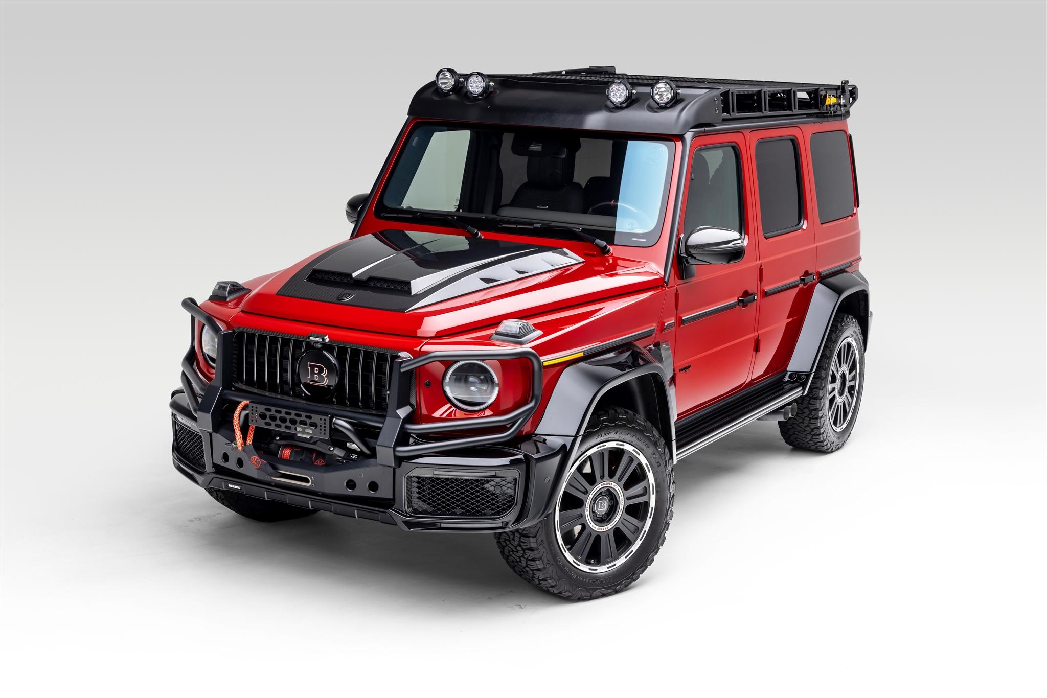 Brabus 20″ HD forged wheels are wrapped in 285/55 BFGoodrich All-Terrain T/A KO2 tires. A matching spare is fitted to a Brabus swing-away tire carrier with carbon-fiber trim. Braking is handled by cross-drilled and vented rotors with red-finished calipers, and Brabus suspension updates include taller springs with adjustable coilovers.
