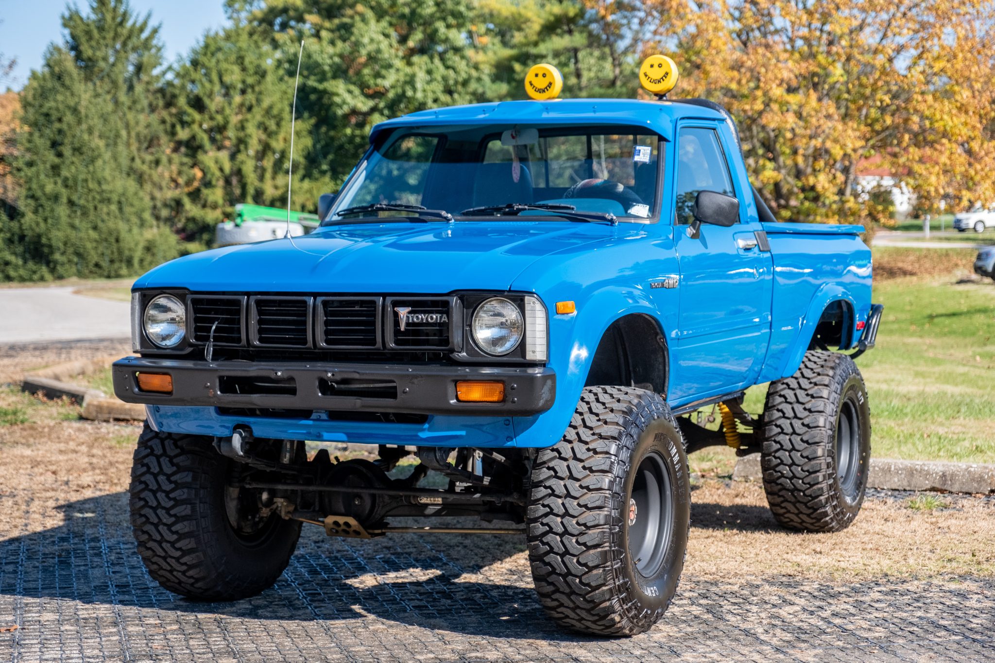 Rebel Racing 15″ steel wheels are fitted over manually locking front hubs and mounted with 33×12.5″ Centennial Dirt Commander M/T tires. Braking is from front discs and rear drums, and a suspension lift has been fitted along with Bilstein shock absorbers at all corners.