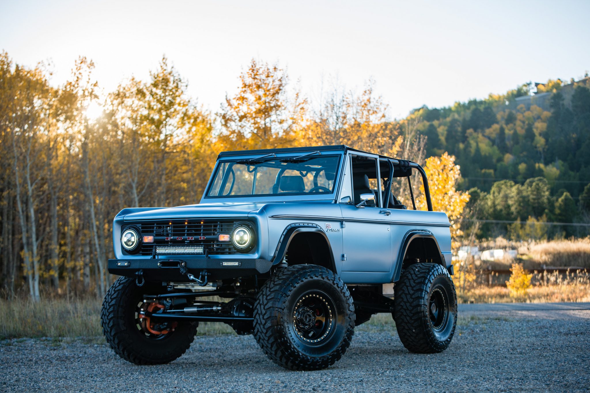 Black 17″ bead-lock wheels wear 37″ Toyo M/T Open Country tires showing 2019 date codes, and a matching spare is mounted to the swing-away carrier. The truck is equipped with a body lift and 12″ ADS coilovers with remote reservoirs and PAC Racing springs. Additional equipment includes custom front radius arms, Reid Racing steering knuckles, and a Fox steering stabilizer. Braking is handled by four-wheel discs with red-finished calipers and a Wilwood brake master cylinder and proportioning valve.