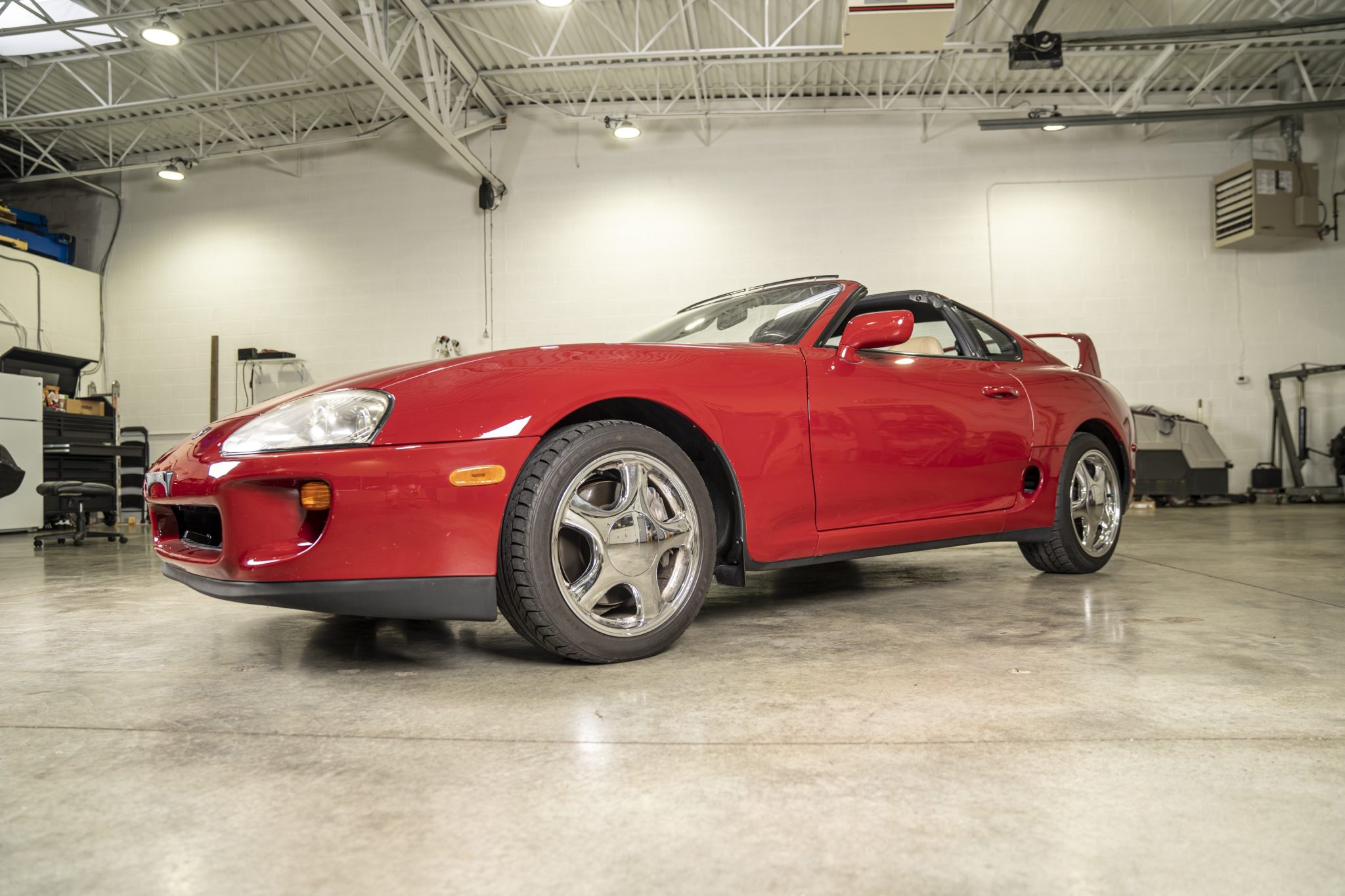 Chrome-finished 17″ five-spoke wheels are mounted with BFGoodrich g-Force Sport tires measuring 235/45 up front and 255/40 out back. Braking is handled by four-wheel anti-lock discs with Supra-branded calipers.