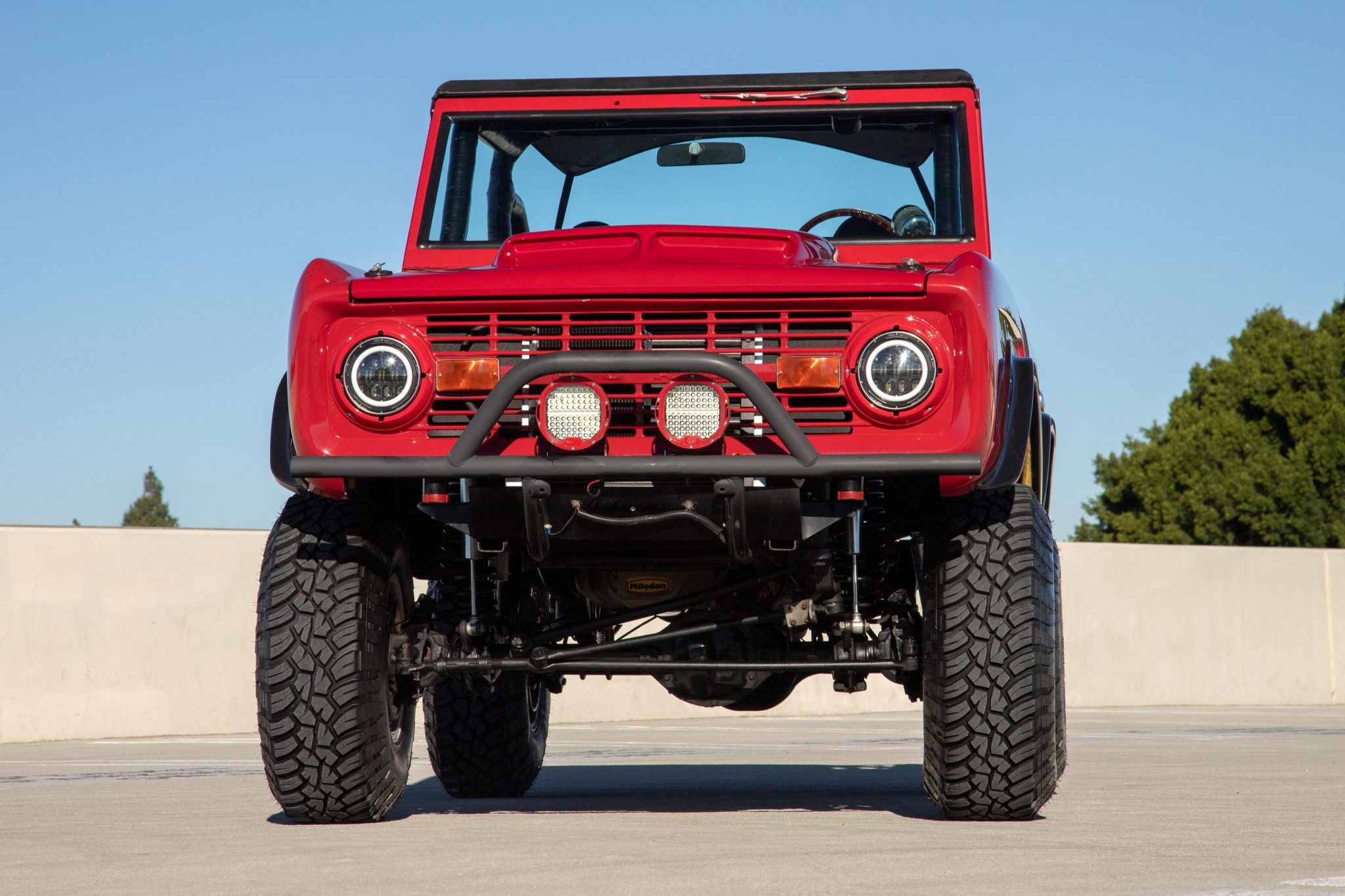 Polished 15″ American Racing wheels are mounted with 33×10.5″ General Grabber tires. The truck is equipped with power steering, and the suspension features dual Bilstein shocks installed at each corner. Braking is handled by power-assisted drums all around.