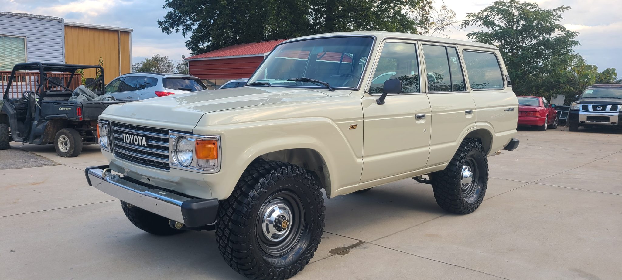 Black-finished 16″ steel wheels wear 285/75 BFGoodrich Mud-Terrain T/A tires that were reportedly installed in 2021. The truck is equipped with manually locking front hubs together and an Old Man Emu suspension lift. The seller reports that the brakes and power-steering system were overhauled during the refurbishment.