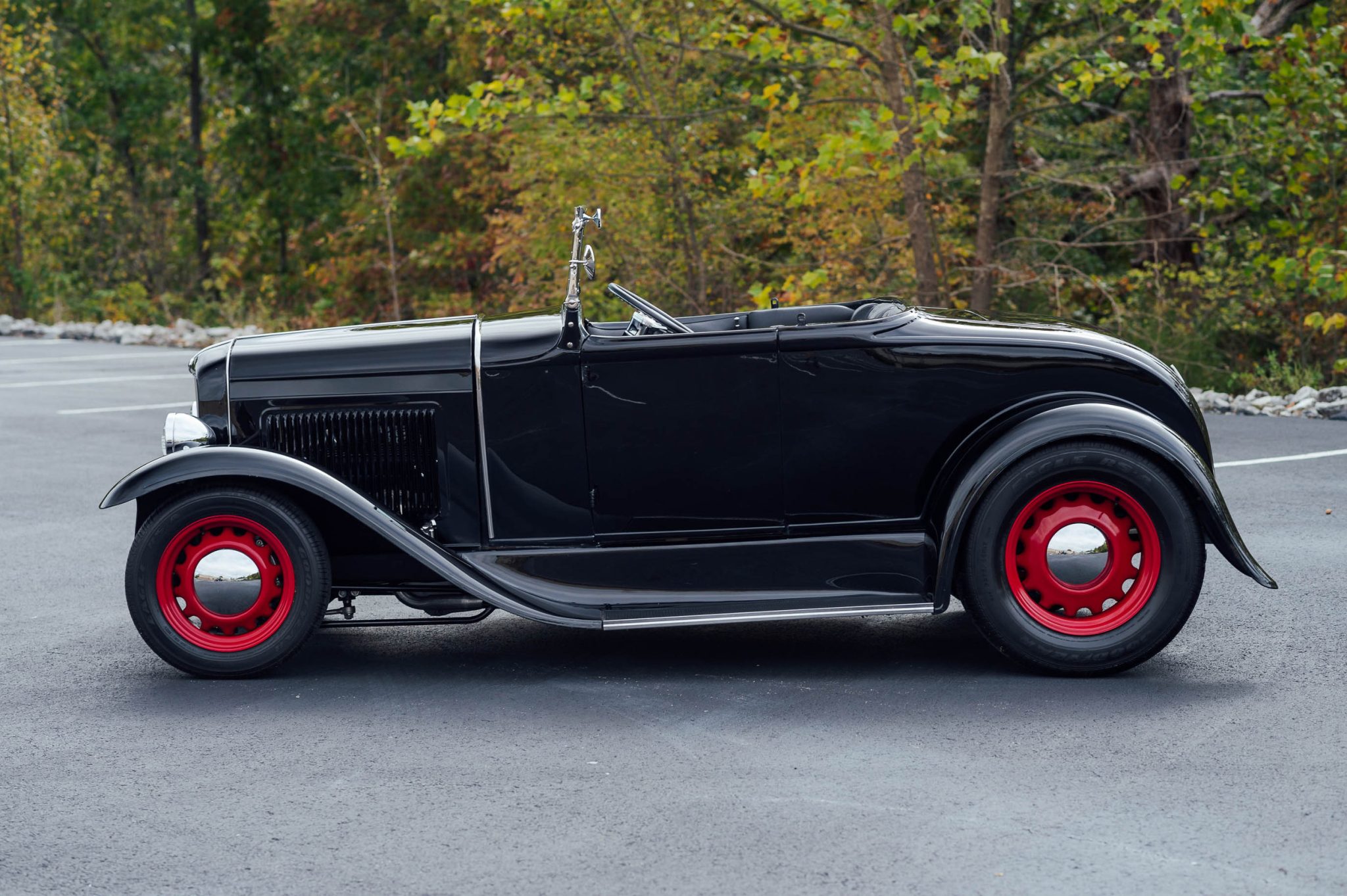 Artillery-style 15″ front and 17″ rear wheels are finished in red with chrome hubcaps and mounted with “big and little” Goodyear Eagle RS-A tires. Stopping power is provided by disc brakes at all four wheels.