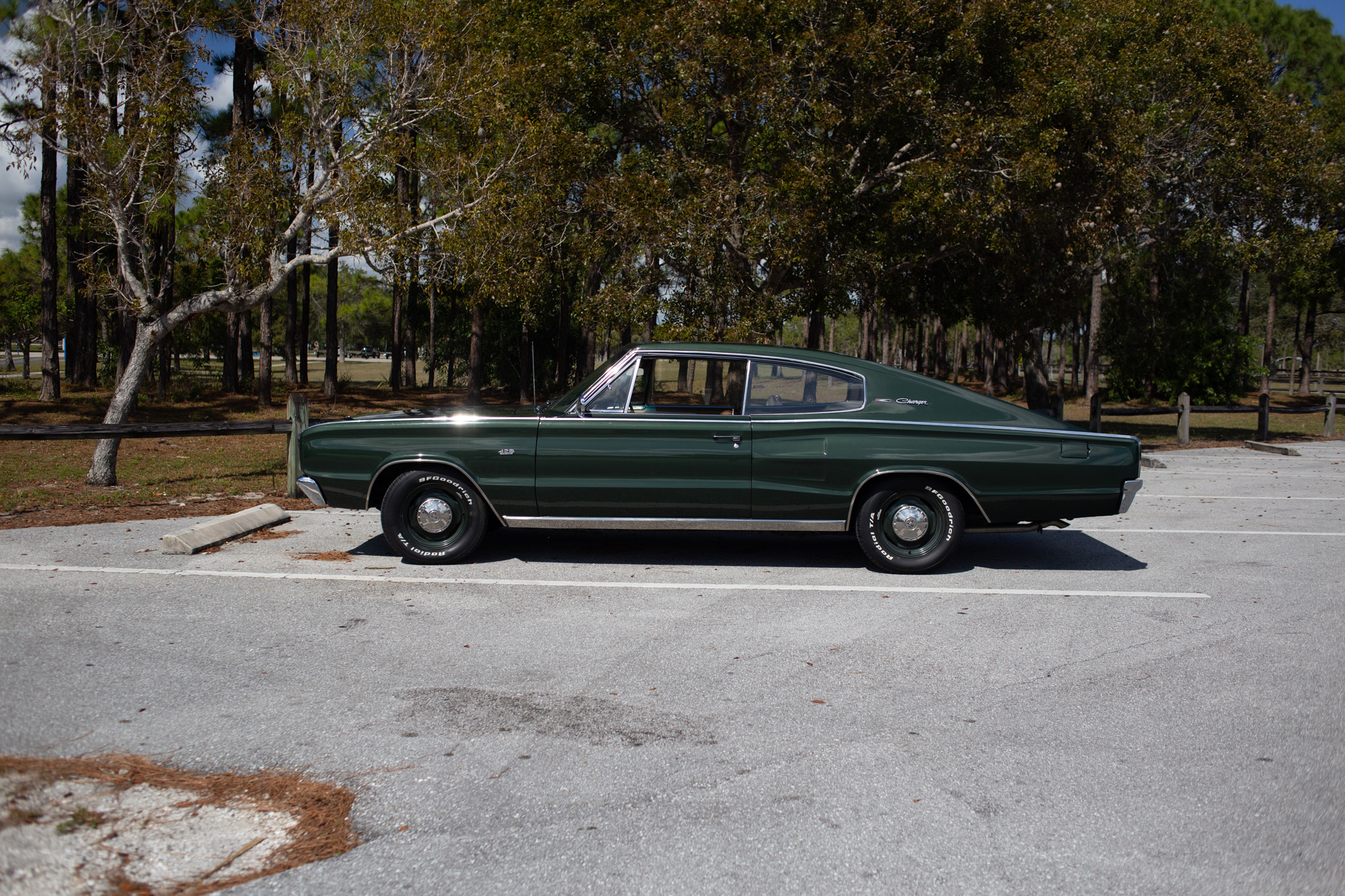 Color-matched 15″ steel wheels wear chrome dog-dish hubcaps and are mounted with 235/60 BFGoodrich Radial T/A tires. Front disc brakes have been installed to complement rear drums.