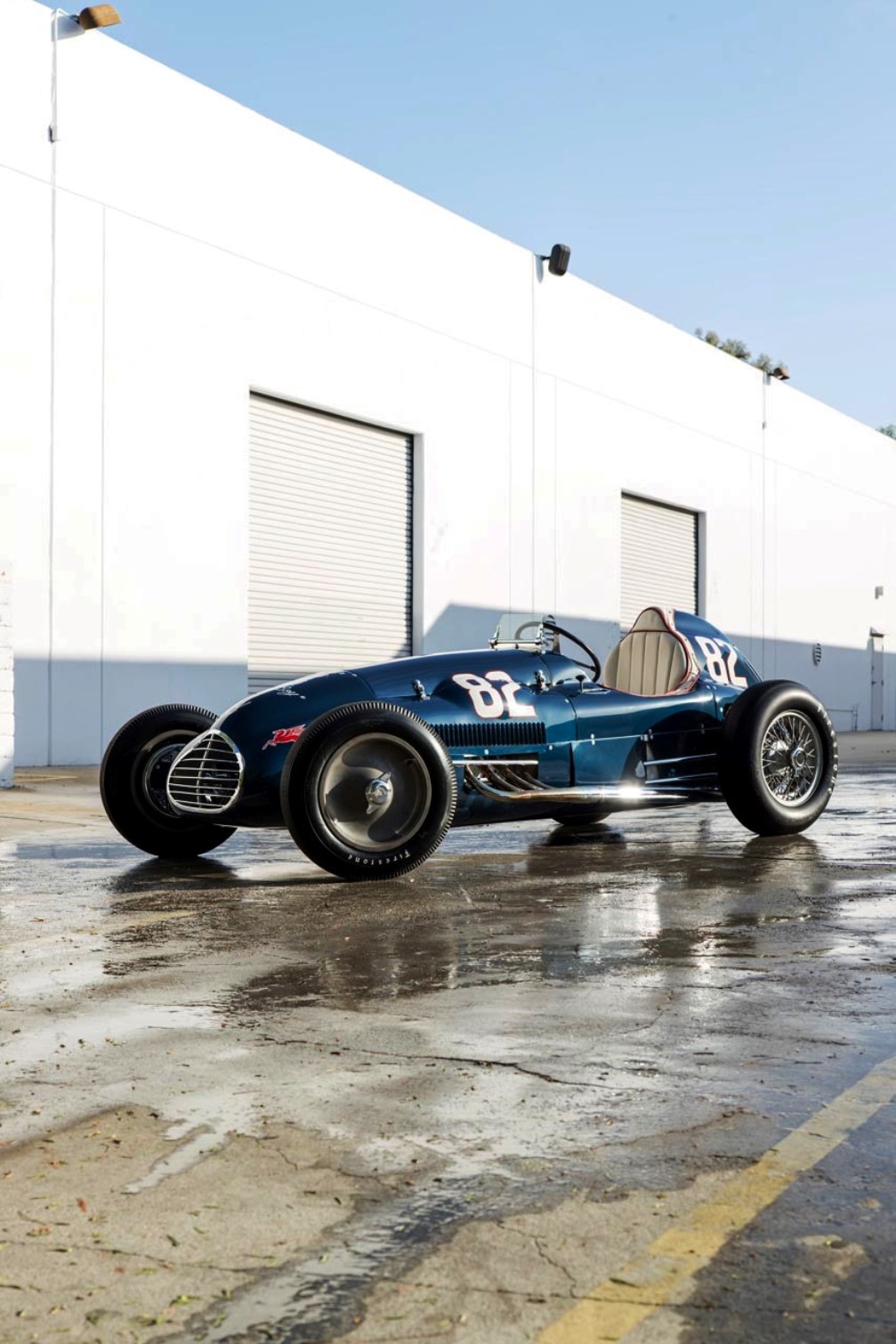 The car’s construction incorporates a chrome-alloy tube frame finished in white, around which aluminum body panels are secured by dzus fasteners. During its 20-year refurbishment, the car’s body panels were stripped to bare metal before being repainted in blue number 82 livery replicating that worn by the car during 1950 Indianapolis 500 qualifying. A replacement panel was fabricated for the portion of the underbelly that wraps beneath the exhaust headers. The nose cone is said to have been modified during the course of the car’s racing career.