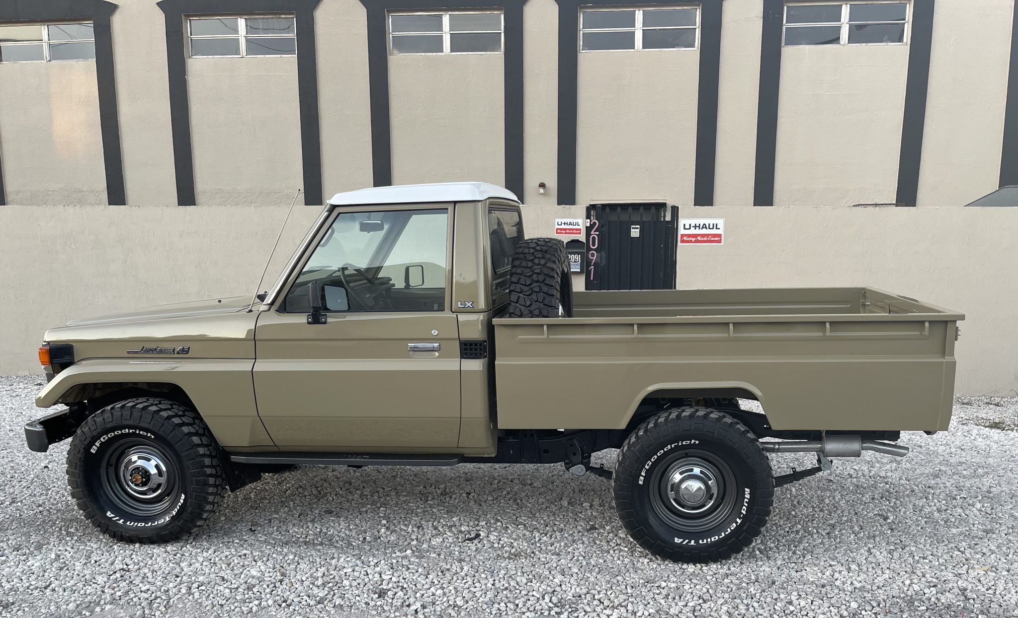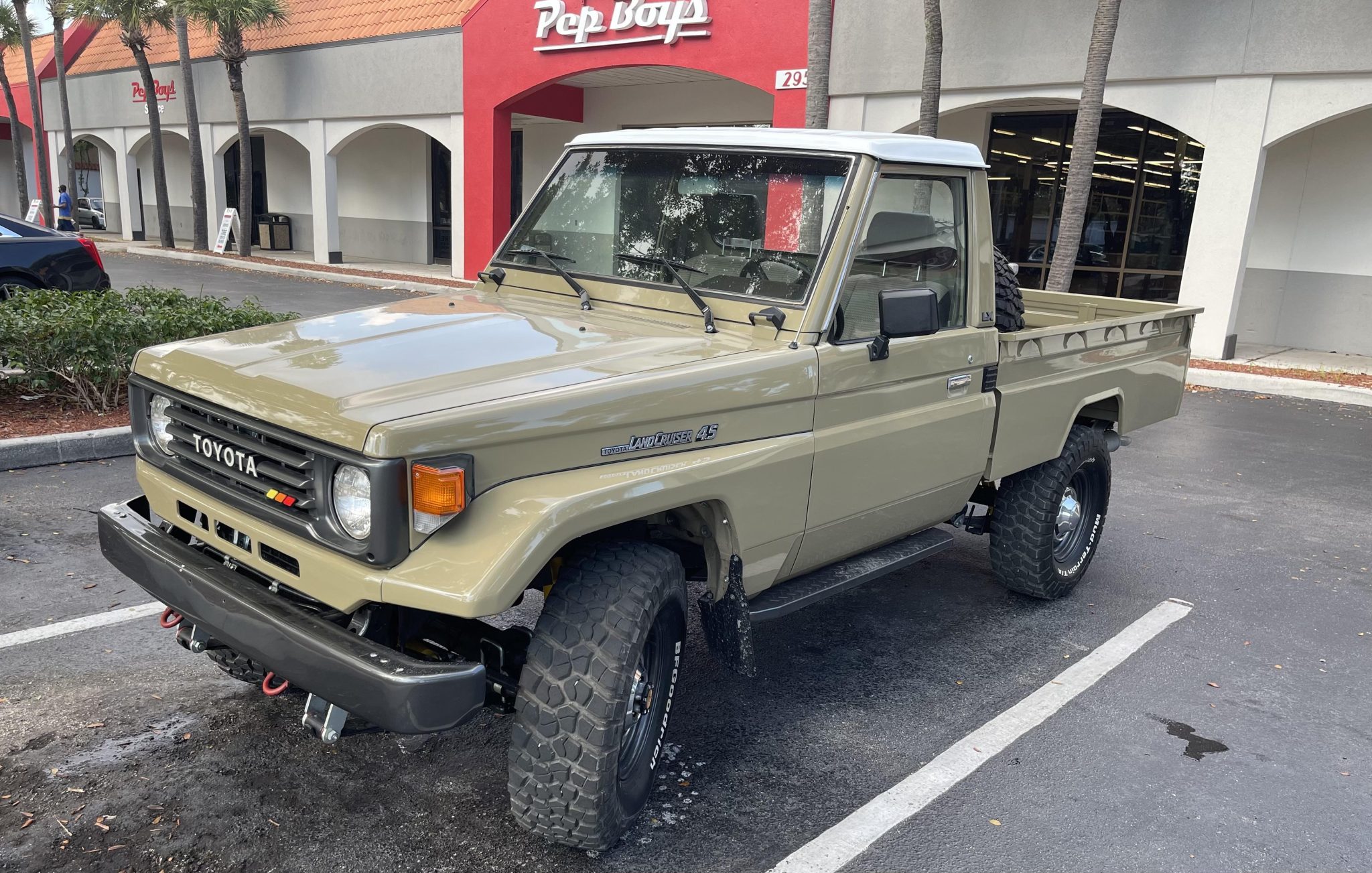 Black-finished steel wheels are accented with silver hubcaps and wear BFGoodrich Mud-Terrain T/A tires, with a matching spare located in the truck bed. Dobinsons suspension components were installed during the refurbishment.