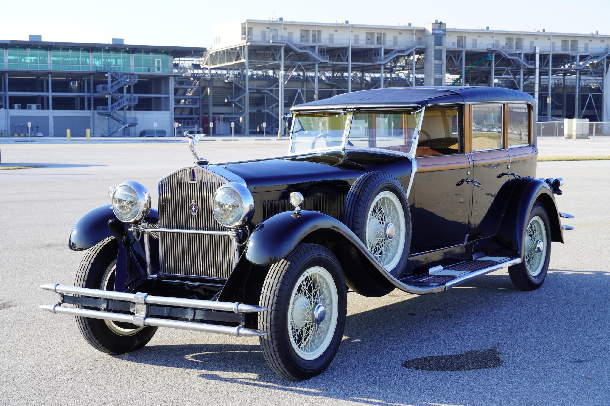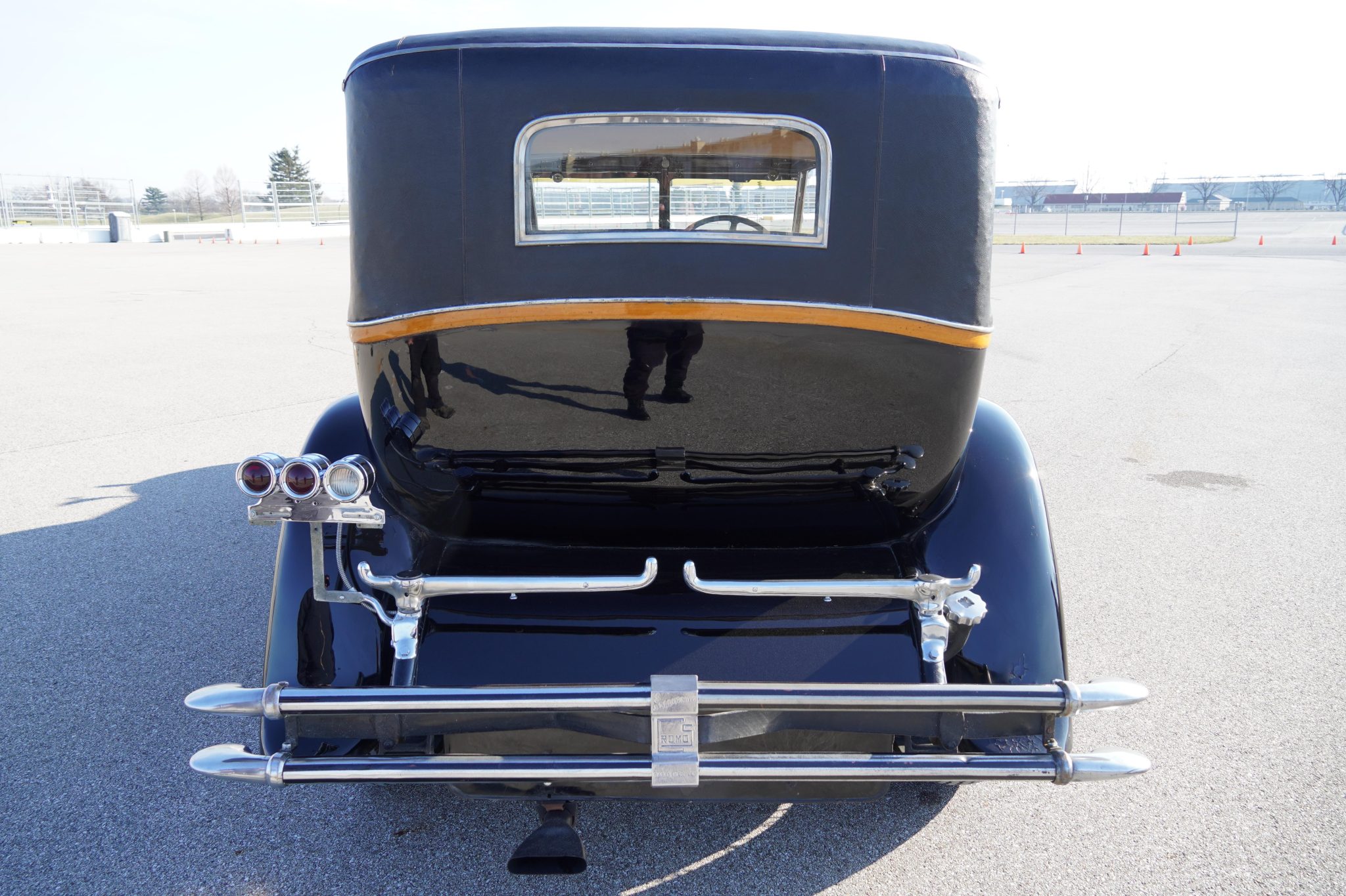 This car features coupé chauffeur bodywork by Carrosserie J. Saoutchik and is finished in black with a matching vinyl top. Features include wood roof pillars and beltline trim, Stephen Grebel headlights, a forward roof panel that rolls up into a storage compartment, a single brake light cluster, running boards, a polished radiator surround, a Spirit of Triumph hood ornament, and a Greek grille badge. The front valance panel was repainted in November 2004. Scratches and chips in the paint are noted by the seller along with pitting on the brightwork.