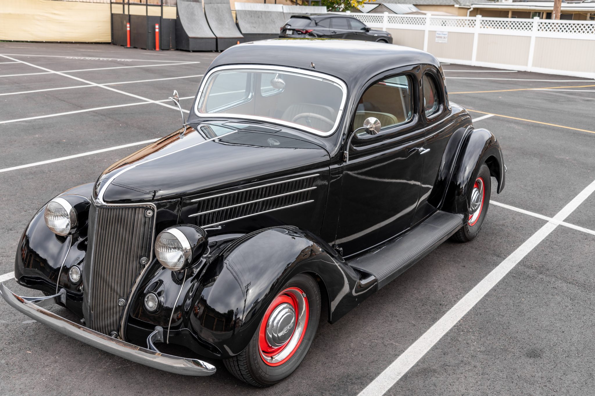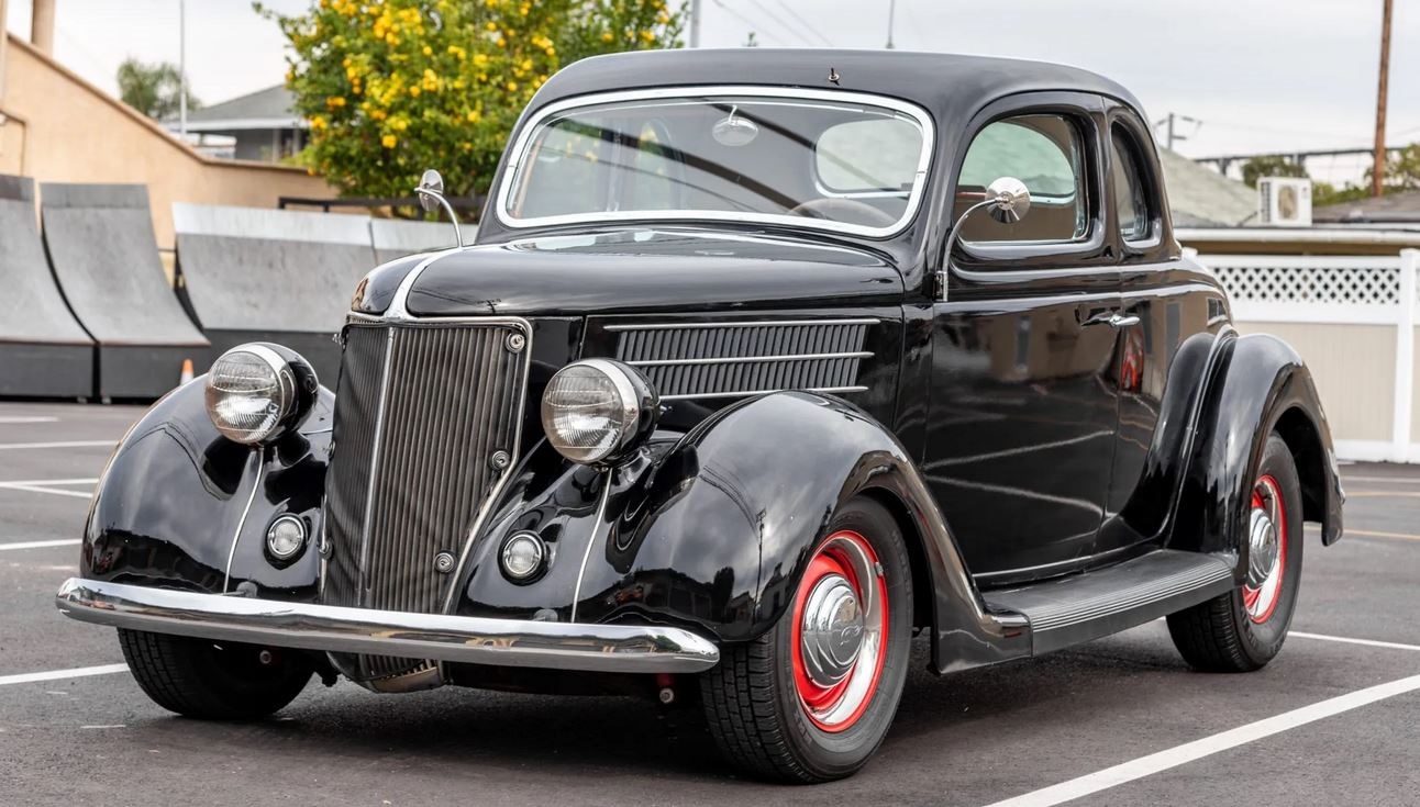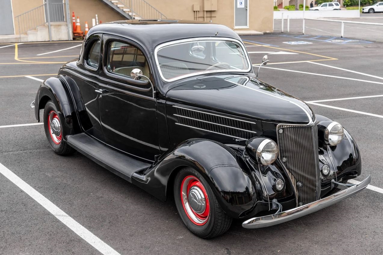 Red 15″ steel wheels feature chrome hubcaps and trim rings, and are mounted with Hercules MRX Plus IV tires measuring 235/75 out back and 205/70 up front. The suspension has been modified with a 4″ drop front axle and a split wishbone kit from Pete and Jakes Hot Rod Parts, a front sway bar, and replacement tube shocks and springs. Additional features include an unassisted Saginaw 525 steering box and front disc brakes.