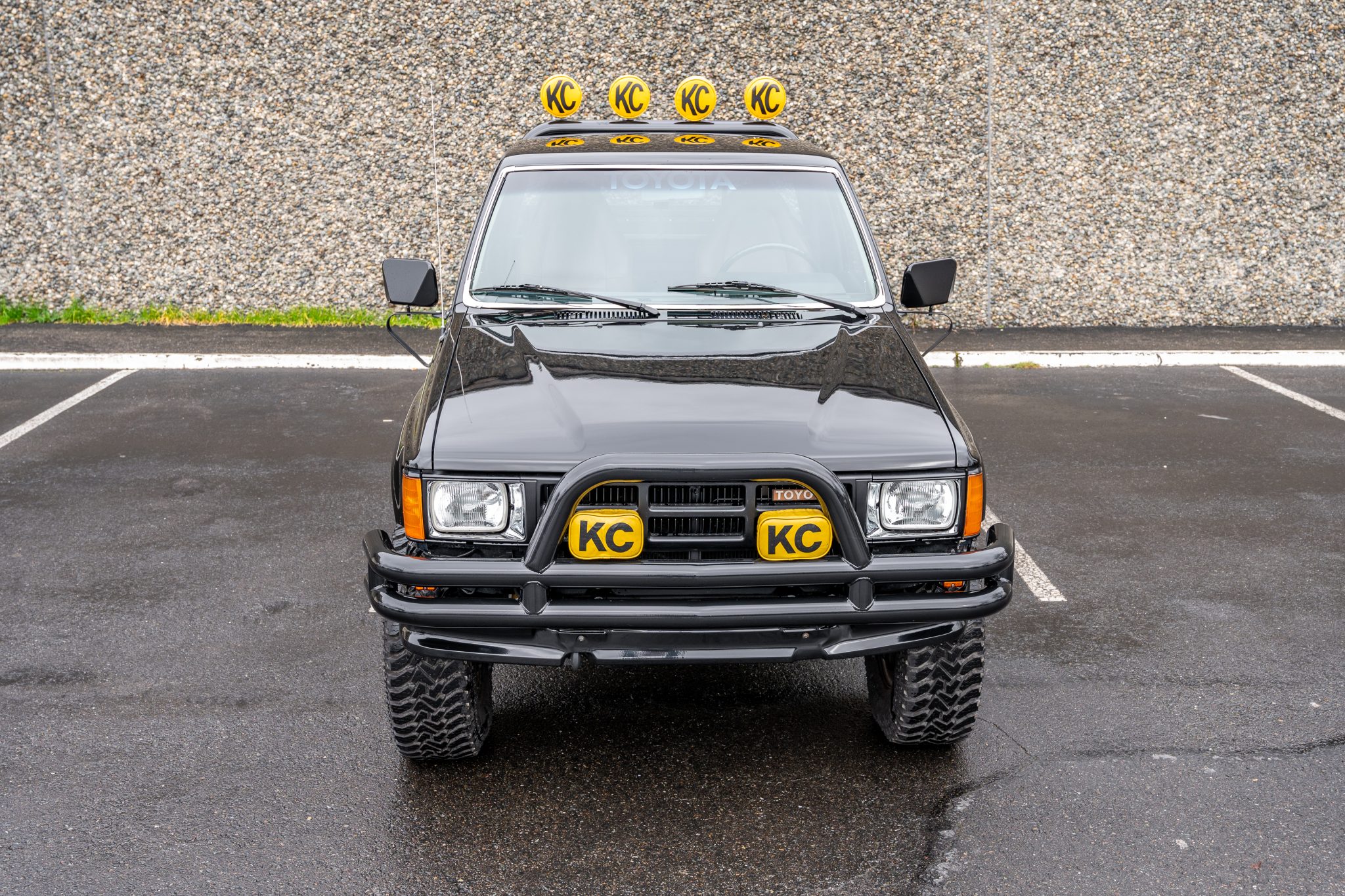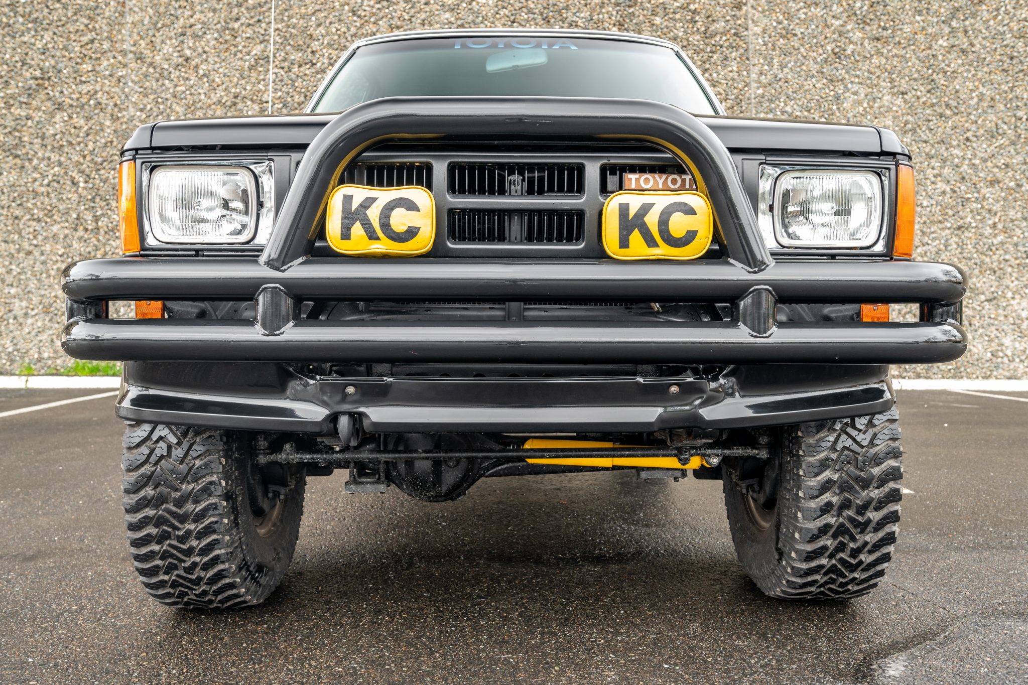Aftermarket 15″ wheels with black centers and polished lips wear 31×10.5″ Goodyear Wrangler Authority T/A tires. The suspension is lifted and fitted with Bilstein shock absorbers at all four corners. Braking is provided by power-assisted front discs and rear drums.